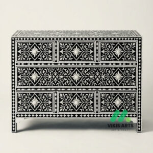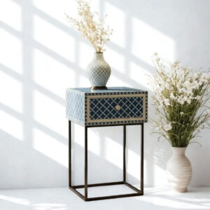 Add timeless elegance to your bedroom with this handcrafted Bone Inlay Bedside Table. Meticulously made by skilled artisans, each piece features intricate bone inlay patterns set into a sturdy wooden frame, creating a striking blend of traditional craftsmanship and contemporary design. The smooth tabletop offers ample space for lamps, books, or décor, while the drawer and shelf provide convenient storage for everyday essentials. Finished with fine detailing and a polished surface, this bedside table is both functional and a statement of luxury, making it a perfect addition to modern, classic, or eclectic interiors.