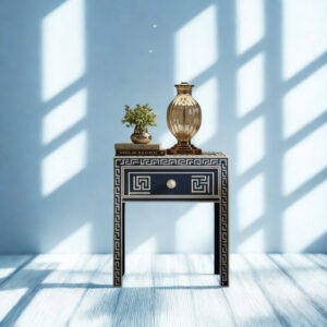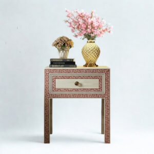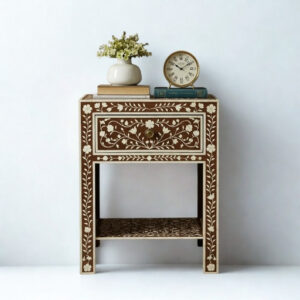 Add timeless elegance to your bedroom with this handcrafted Bone Inlay Bedside Table. Meticulously made by skilled artisans, each piece features intricate bone inlay patterns set into a sturdy wooden frame, creating a striking blend of traditional craftsmanship and contemporary design. The smooth tabletop offers ample space for lamps, books, or décor, while the drawer and shelf provide convenient storage for everyday essentials. Finished with fine detailing and a polished surface, this bedside table is both functional and a statement of luxury, making it a perfect addition to modern, classic, or eclectic interiors.