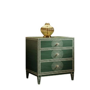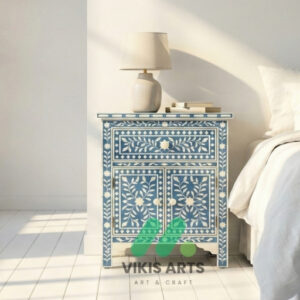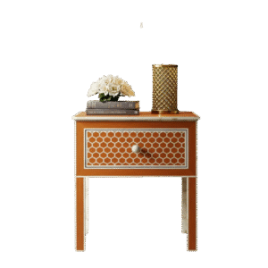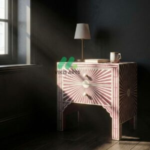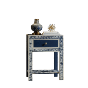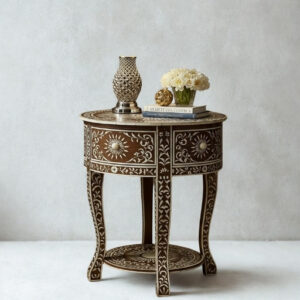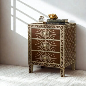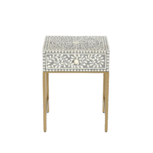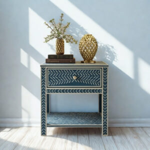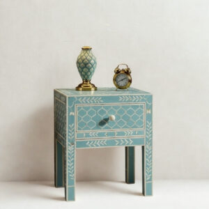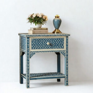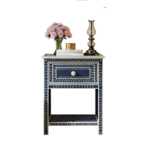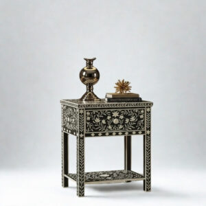 Add timeless elegance to your bedroom with this handcrafted Bone Inlay Bedside Table. Meticulously made by skilled artisans, each piece features intricate bone inlay patterns set into a sturdy wooden frame, creating a striking blend of traditional craftsmanship and contemporary design. The smooth tabletop offers ample space for lamps, books, or décor, while the drawer and shelf provide convenient storage for everyday essentials. Finished with fine detailing and a polished surface, this bedside table is both functional and a statement of luxury, making it a perfect addition to modern, classic, or eclectic interiors.