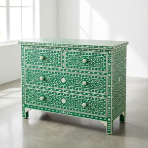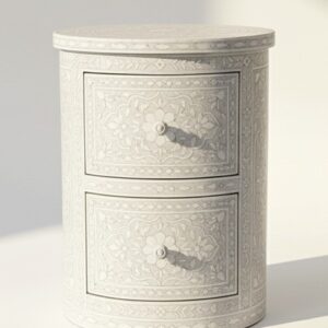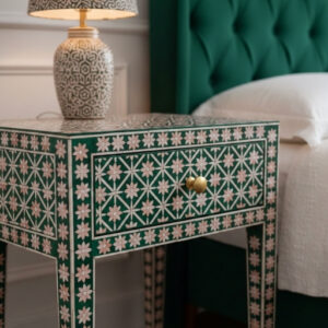 Add timeless elegance to your bedroom with this handcrafted Bone Inlay Bedside Table. Meticulously made by skilled artisans, each piece features intricate bone inlay patterns set into a sturdy wooden frame, creating a striking blend of traditional craftsmanship and contemporary design. The smooth tabletop offers ample space for lamps, books, or décor, while the drawer and shelf provide convenient storage for everyday essentials. Finished with fine detailing and a polished surface, this bedside table is both functional and a statement of luxury, making it a perfect addition to modern, classic, or eclectic interiors.