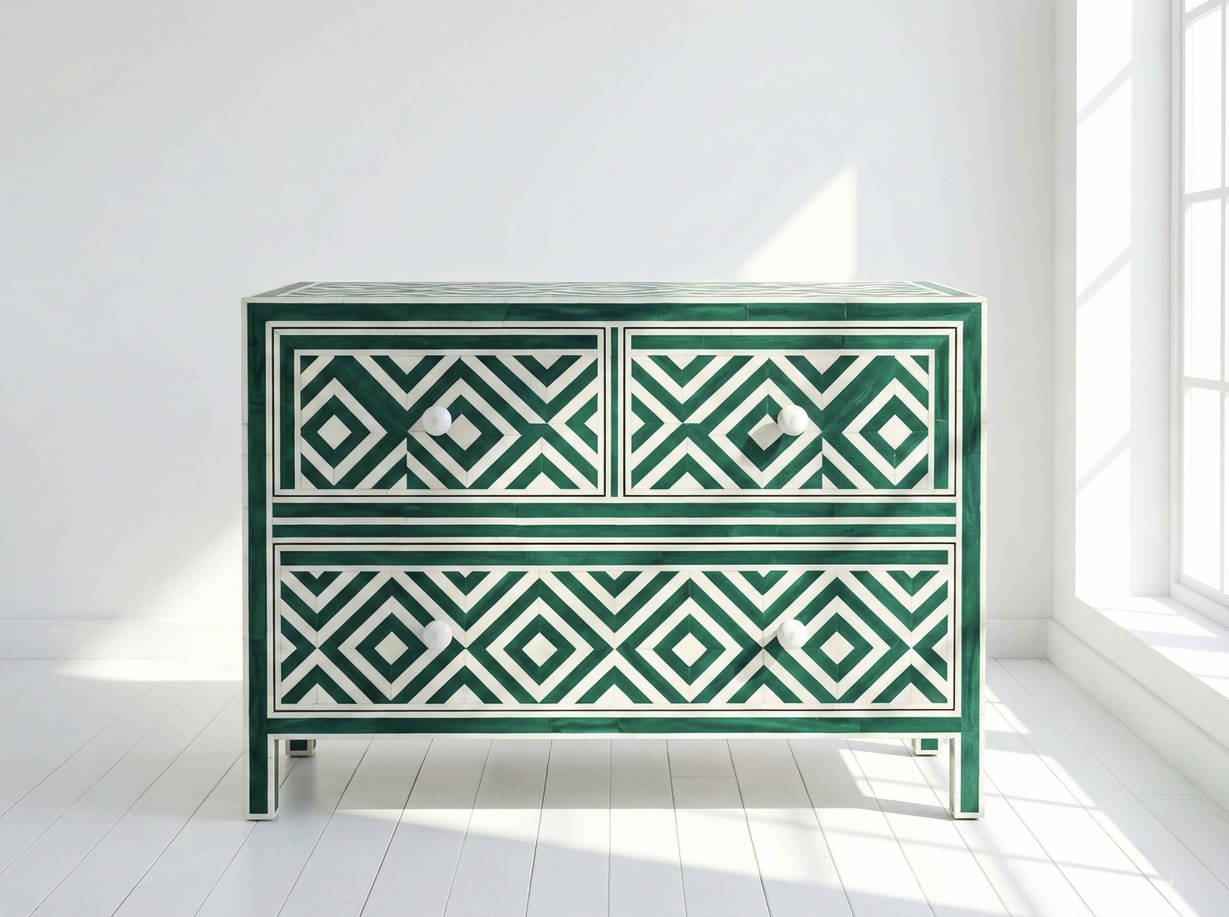 Add refined charm to your space with this Bone Inlay 3 Chest of Drawers. Handcrafted by skilled artisans, it features elegant bone inlay work carefully set into a solid wooden frame, showcasing timeless craftsmanship and intricate detailing. Designed with three spacious drawers, it offers convenient storage for clothing, accessories, or everyday essentials while maintaining a compact footprint. Finished with smooth metal hardware and a polished surface, this chest of drawers complements modern, bohemian, and classic interiors beautifully. Perfect for bedrooms, living areas, or as a stylish accent piece, it combines functionality with artisanal elegance.