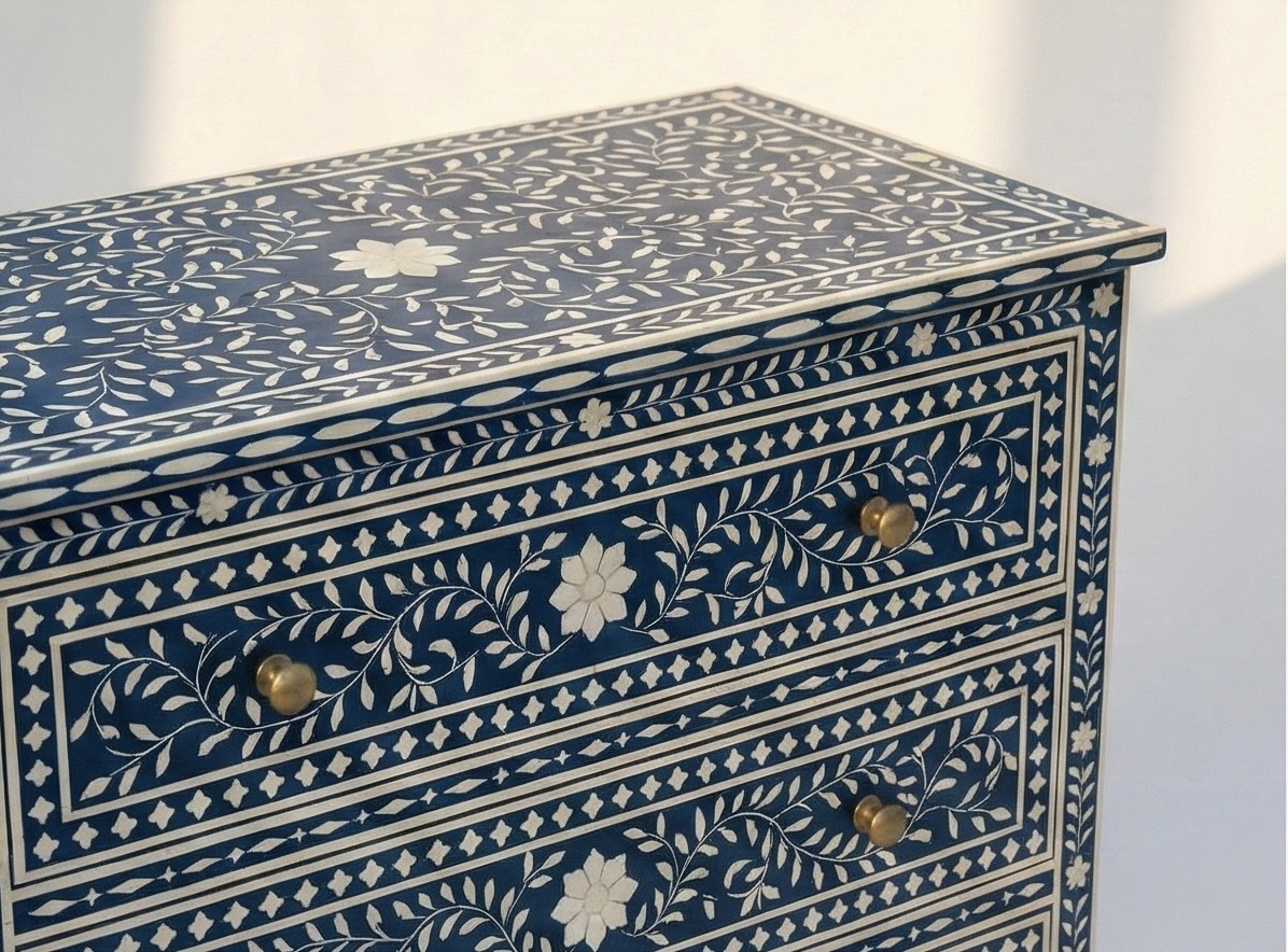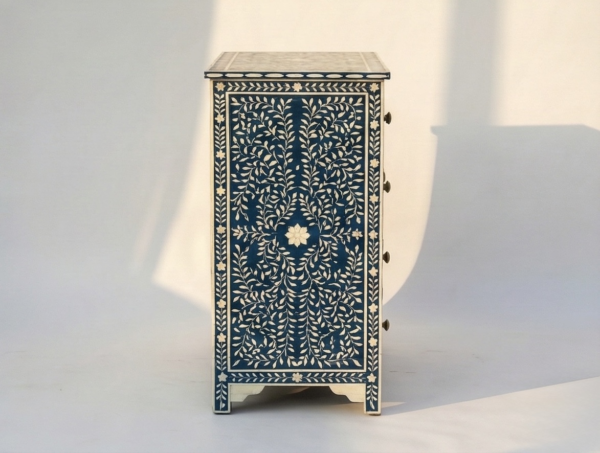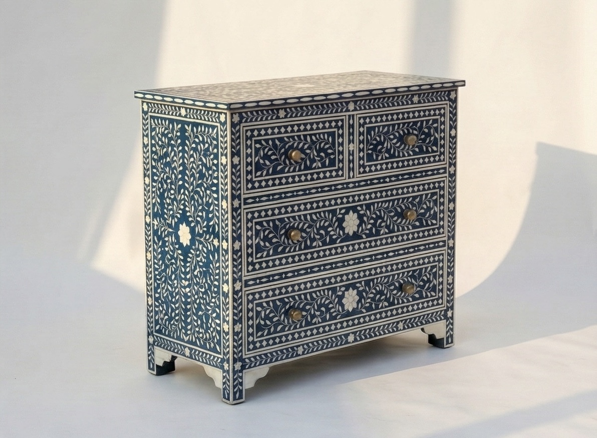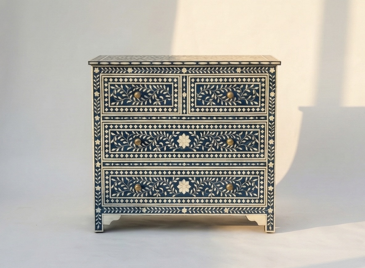 Add timeless elegance and functional storage to your space with this handcrafted Bone Inlay 4 Chest of Drawers. Expert artisans meticulously set natural bone pieces into a solid wood frame, forming intricate patterns that reflect traditional craftsmanship and refined design. Featuring four spacious drawers, this chest offers ample storage for clothing, linens, or everyday essentials while keeping your room organized and clutter-free. Finished with smooth metal knobs and a polished surface, it blends beauty with durability. Perfect for bedrooms, living areas, or hallways, this bone inlay chest of drawers makes a striking statement in both classic and contemporary interiors.