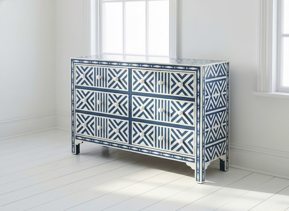 Elevate your home décor with the timeless elegance of this Bone Inlay 6 Chest of Drawers. Expertly handcrafted by skilled artisans, it features intricate bone inlay detailing set into a sturdy wooden frame, creating a refined and eye-catching design. The six spacious drawers provide ample storage for clothing, accessories, or everyday essentials, helping keep your space beautifully organized. Finished with smooth metal knobs and a polished surface, this chest of drawers blends seamlessly with modern, bohemian, and classic interiors. Ideal for bedrooms, living rooms, or hallways, it offers the perfect balance of functionality and artisanal craftsmanship.