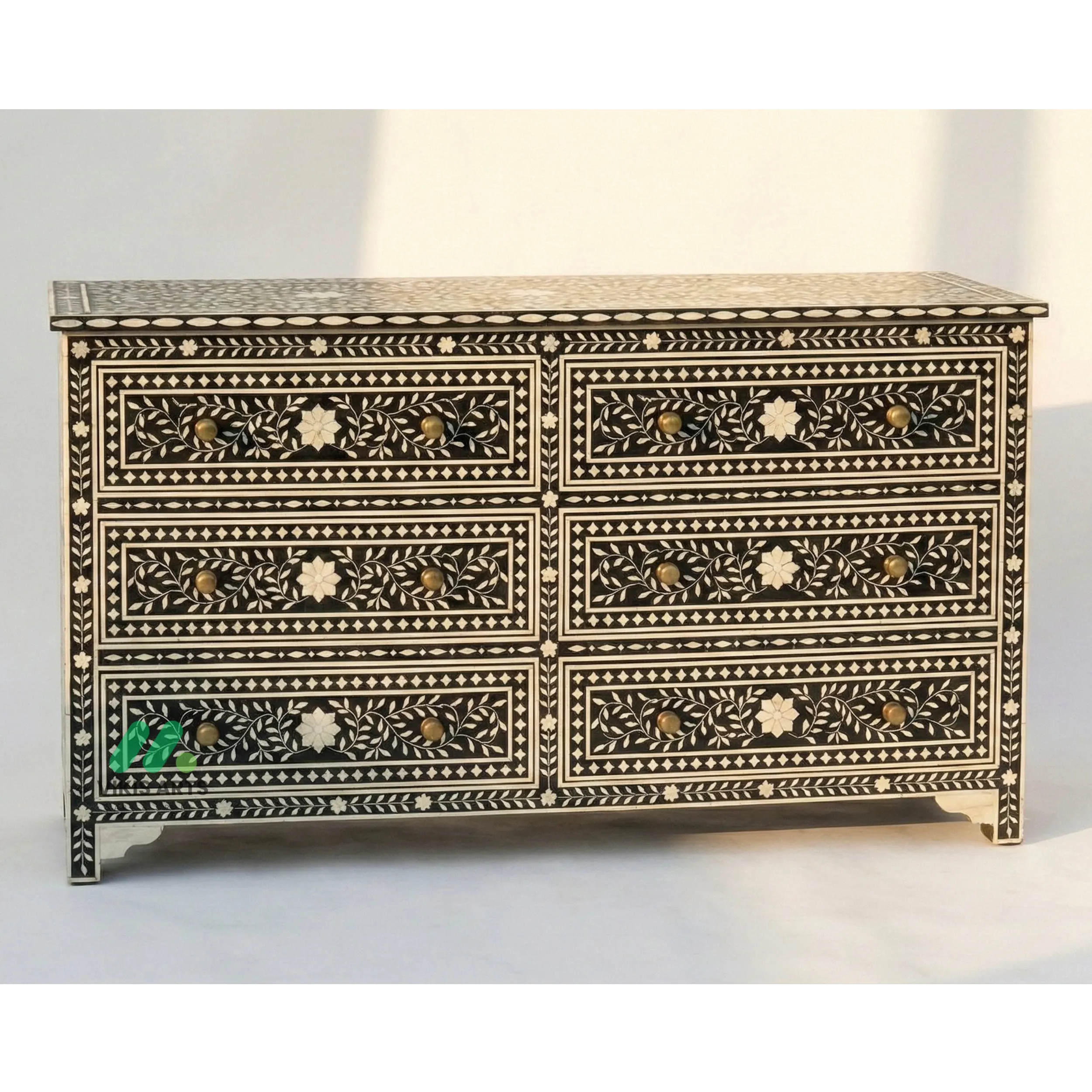 Elevate your home décor with the timeless elegance of this Bone Inlay 6 Chest of Drawers. Expertly handcrafted by skilled artisans, it features intricate bone inlay detailing set into a sturdy wooden frame, creating a refined and eye-catching design. The six spacious drawers provide ample storage for clothing, accessories, or everyday essentials, helping keep your space beautifully organized. Finished with smooth metal knobs and a polished surface, this chest of drawers blends seamlessly with modern, bohemian, and classic interiors. Ideal for bedrooms, living rooms, or hallways, it offers the perfect balance of functionality and artisanal craftsmanship.