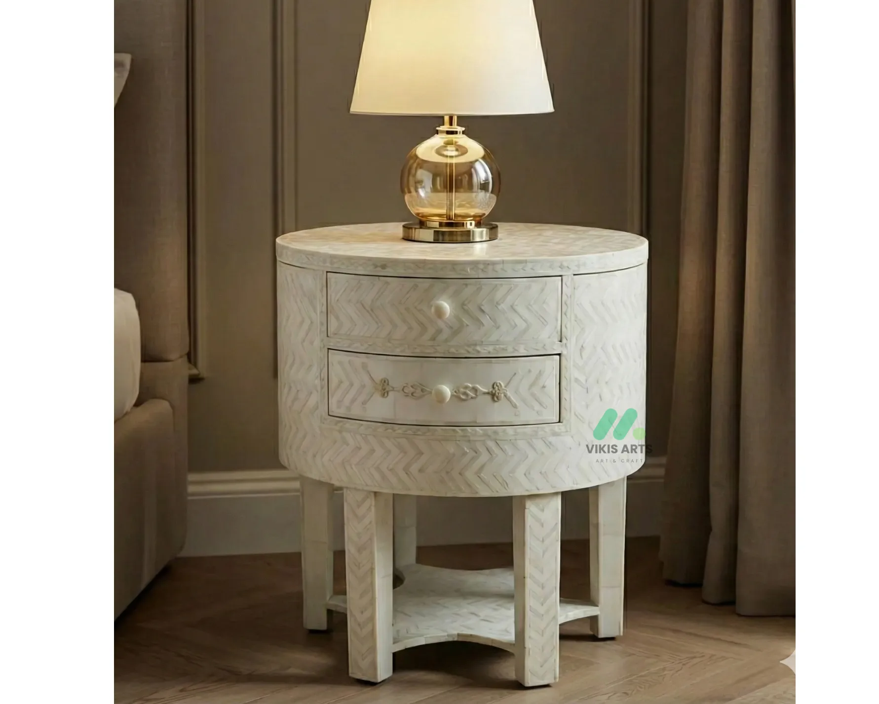 Bone inlay White Round bedside table with 2 Drawers
