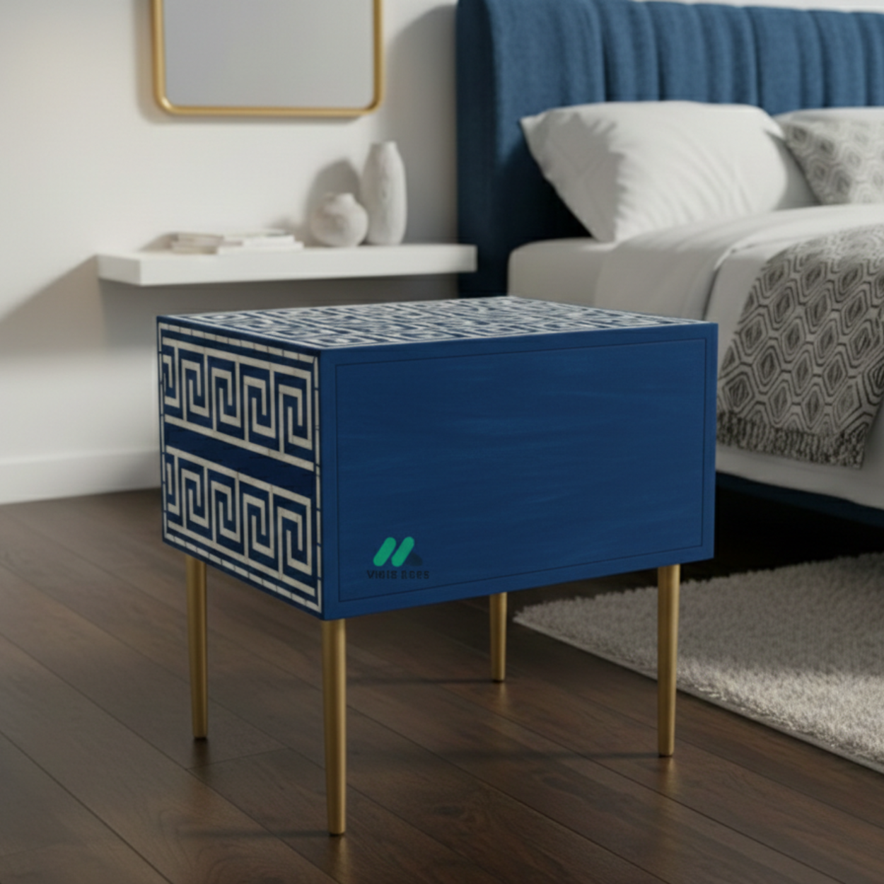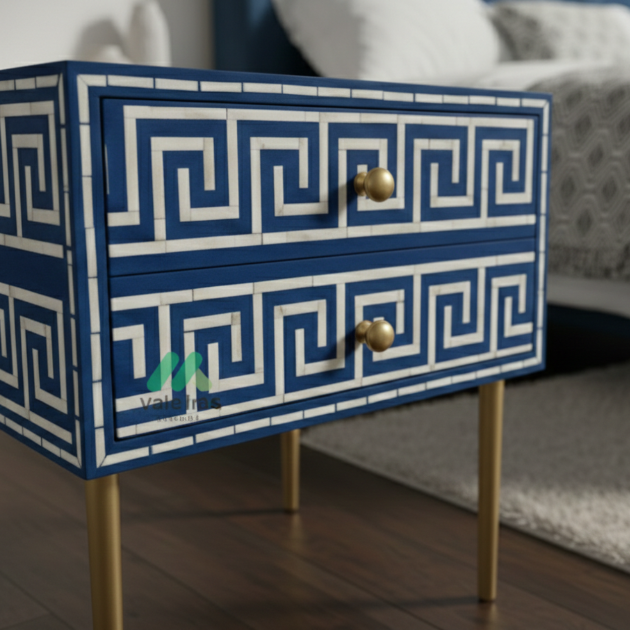 Bone inlay Blue bedside table with 2 Drawers