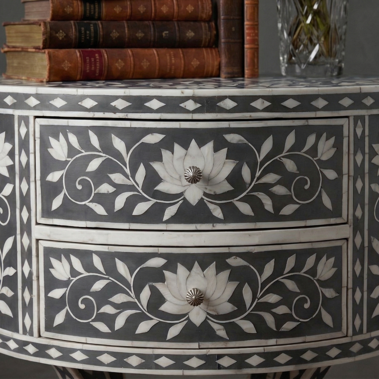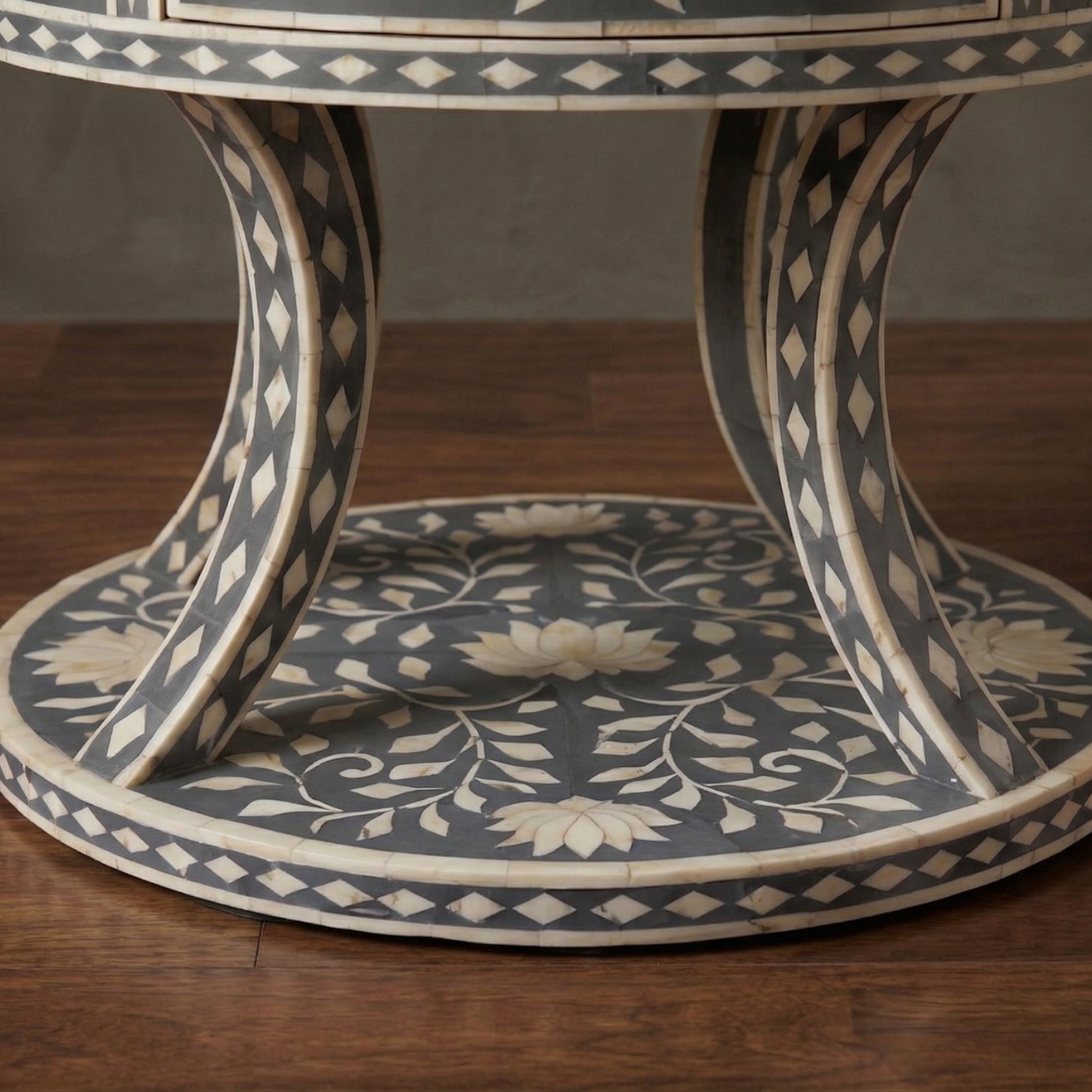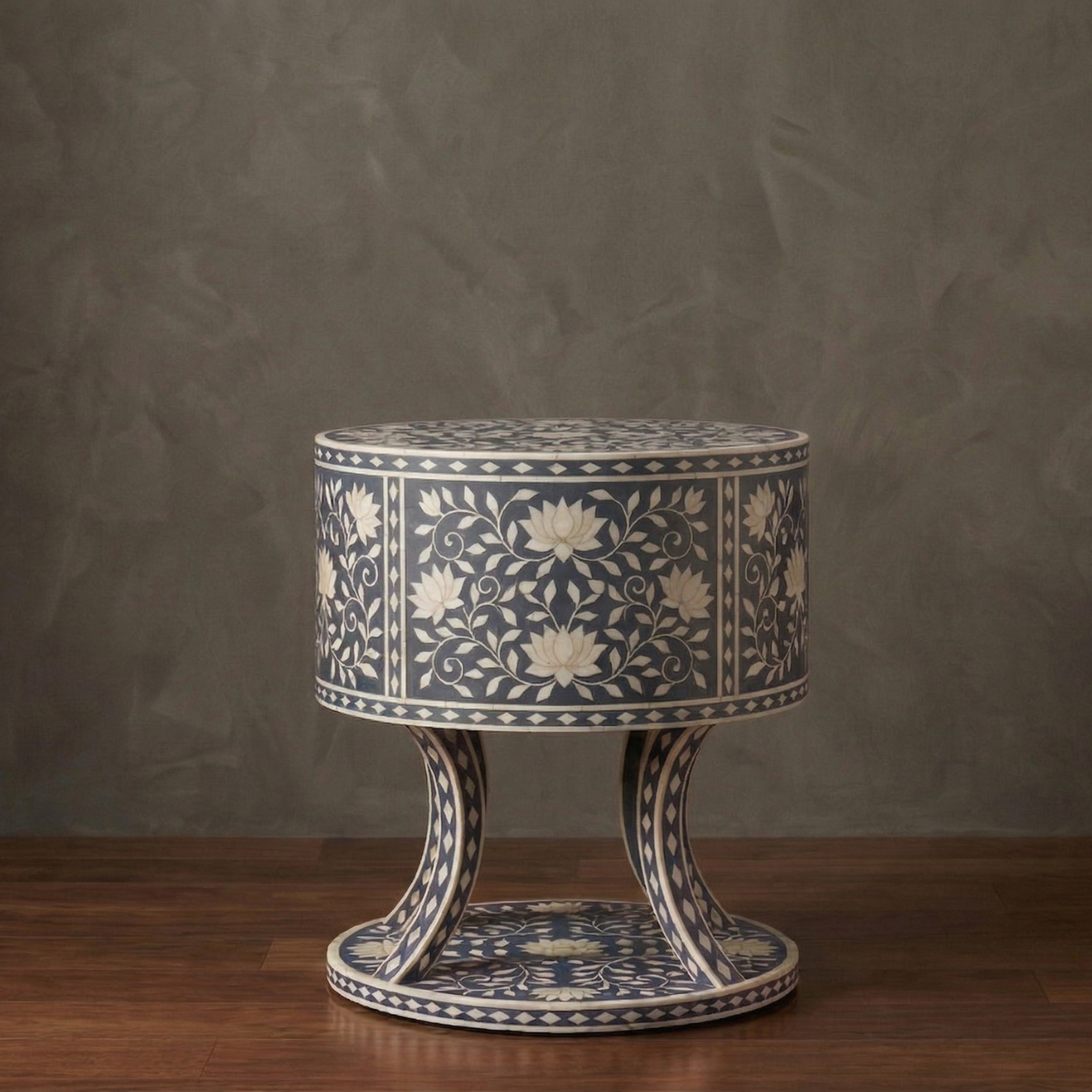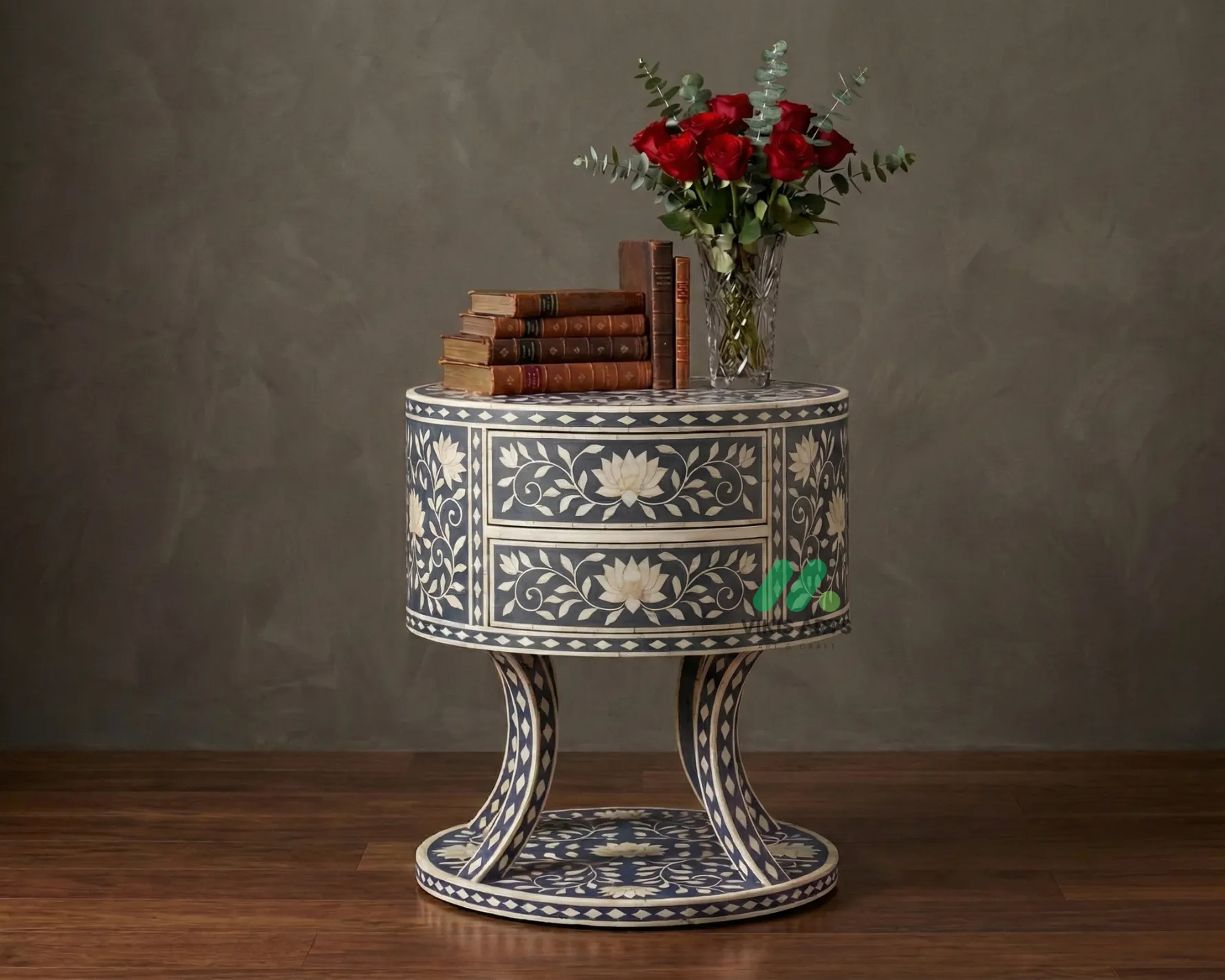 Add timeless elegance to your bedroom with this handcrafted Bone Inlay Bedside Table. Meticulously made by skilled artisans, each piece features intricate bone inlay patterns set into a sturdy wooden frame, creating a striking blend of traditional craftsmanship and contemporary design. The smooth tabletop offers ample space for lamps, books, or décor, while the drawer and shelf provide convenient storage for everyday essentials. Finished with fine detailing and a polished surface, this bedside table is both functional and a statement of luxury, making it a perfect addition to modern, classic, or eclectic interiors.