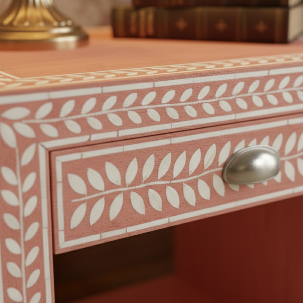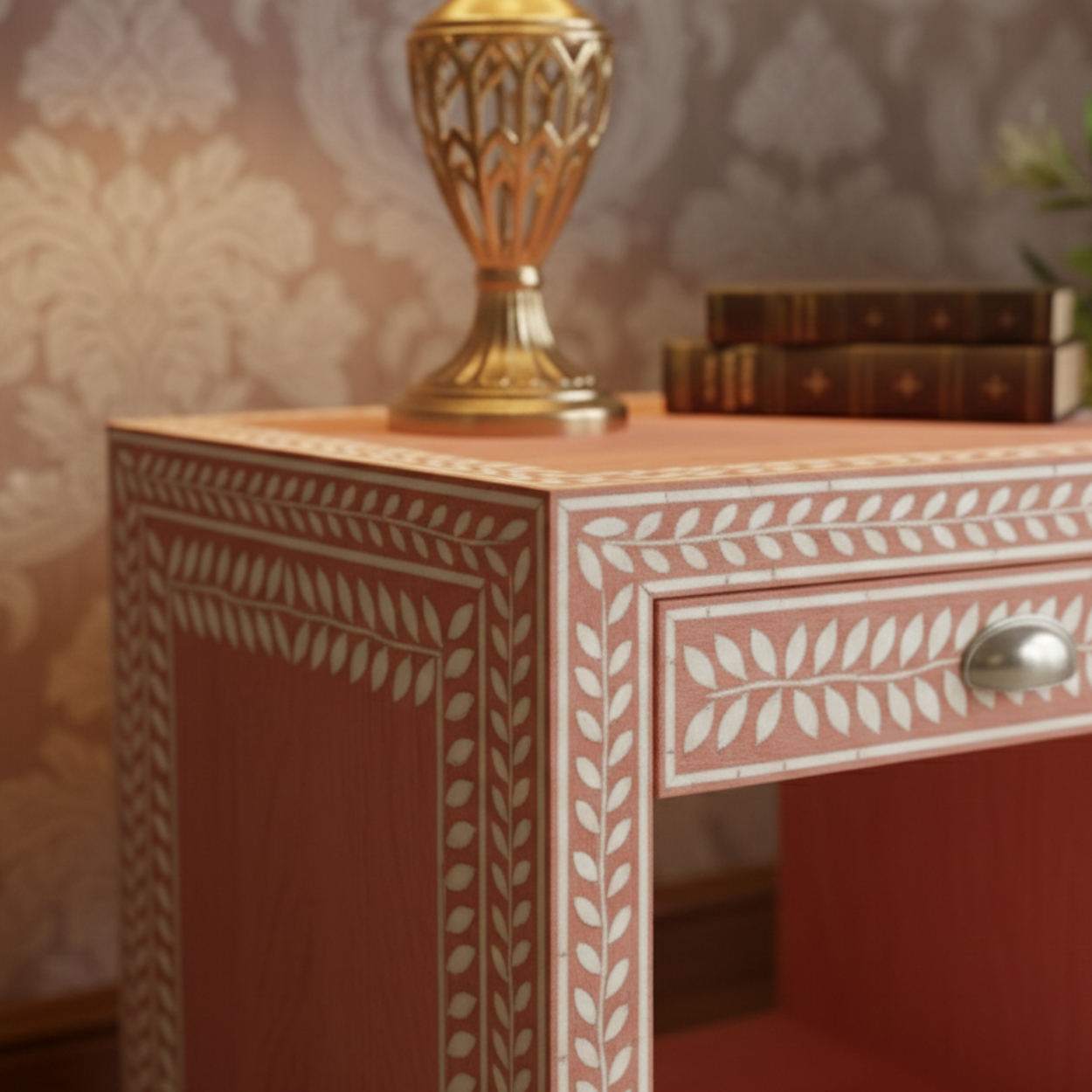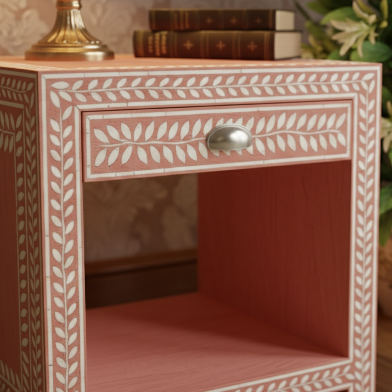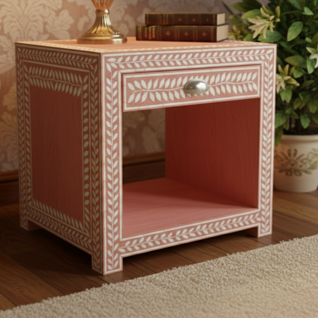 Bone Inlay Pink Bedside Table with 1 Drawer