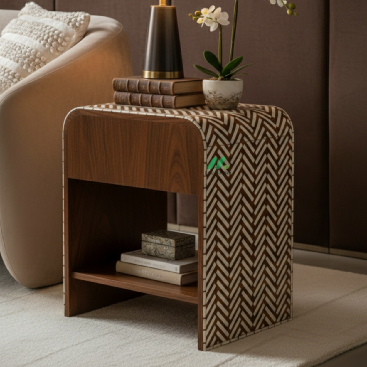 Add timeless elegance to your bedroom with this handcrafted Bone Inlay Bedside Table. Meticulously made by skilled artisans, each piece features intricate bone inlay patterns set into a sturdy wooden frame, creating a striking blend of traditional craftsmanship and contemporary design. The smooth tabletop offers ample space for lamps, books, or décor, while the drawer and shelf provide convenient storage for everyday essentials. Finished with fine detailing and a polished surface, this bedside table is both functional and a statement of luxury, making it a perfect addition to modern, classic, or eclectic interiors.