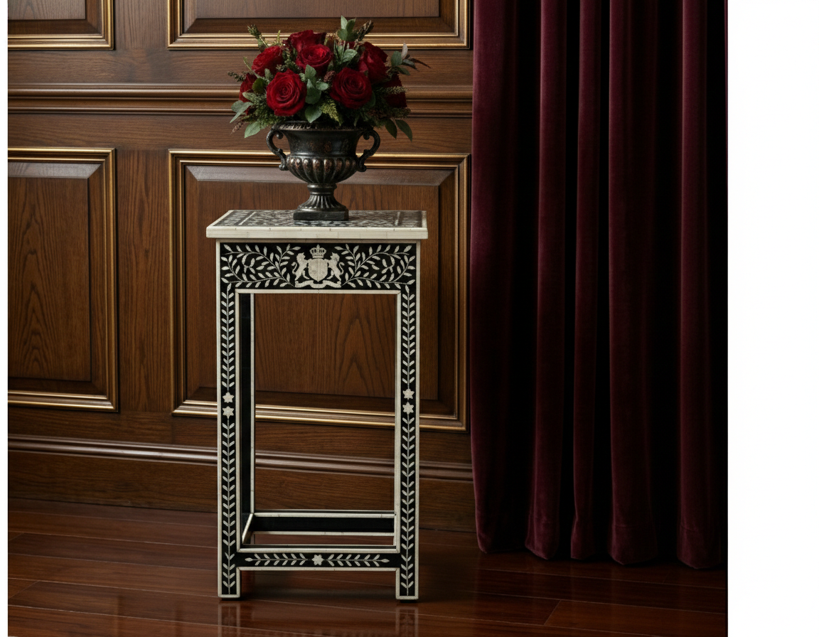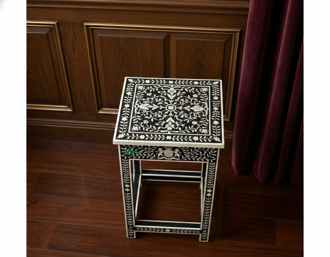 Add timeless elegance to your bedroom with this handcrafted Bone Inlay Bedside Table. Meticulously made by skilled artisans, each piece features intricate bone inlay patterns set into a sturdy wooden frame, creating a striking blend of traditional craftsmanship and contemporary design. The smooth tabletop offers ample space for lamps, books, or décor, while the drawer and shelf provide convenient storage for everyday essentials. Finished with fine detailing and a polished surface, this bedside table is both functional and a statement of luxury, making it a perfect addition to modern, classic, or eclectic interiors.
