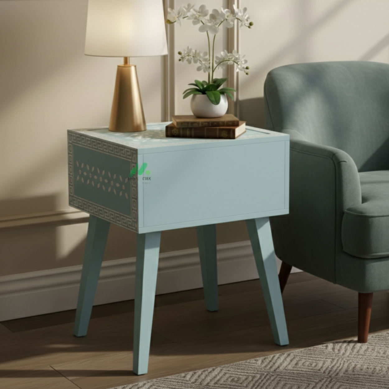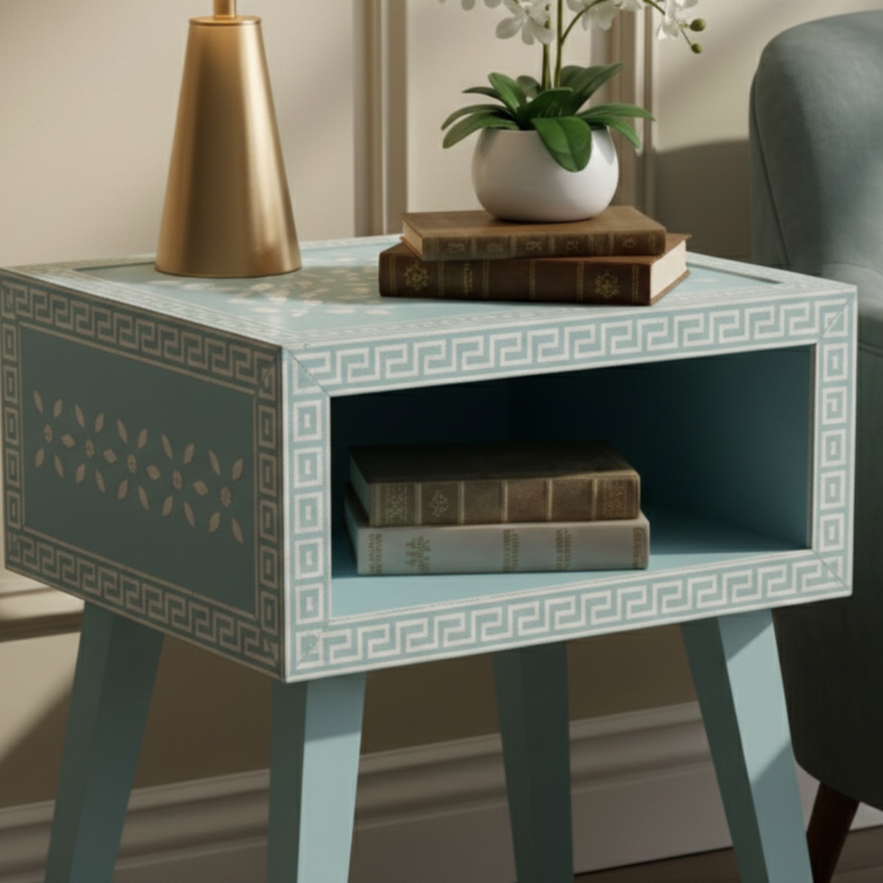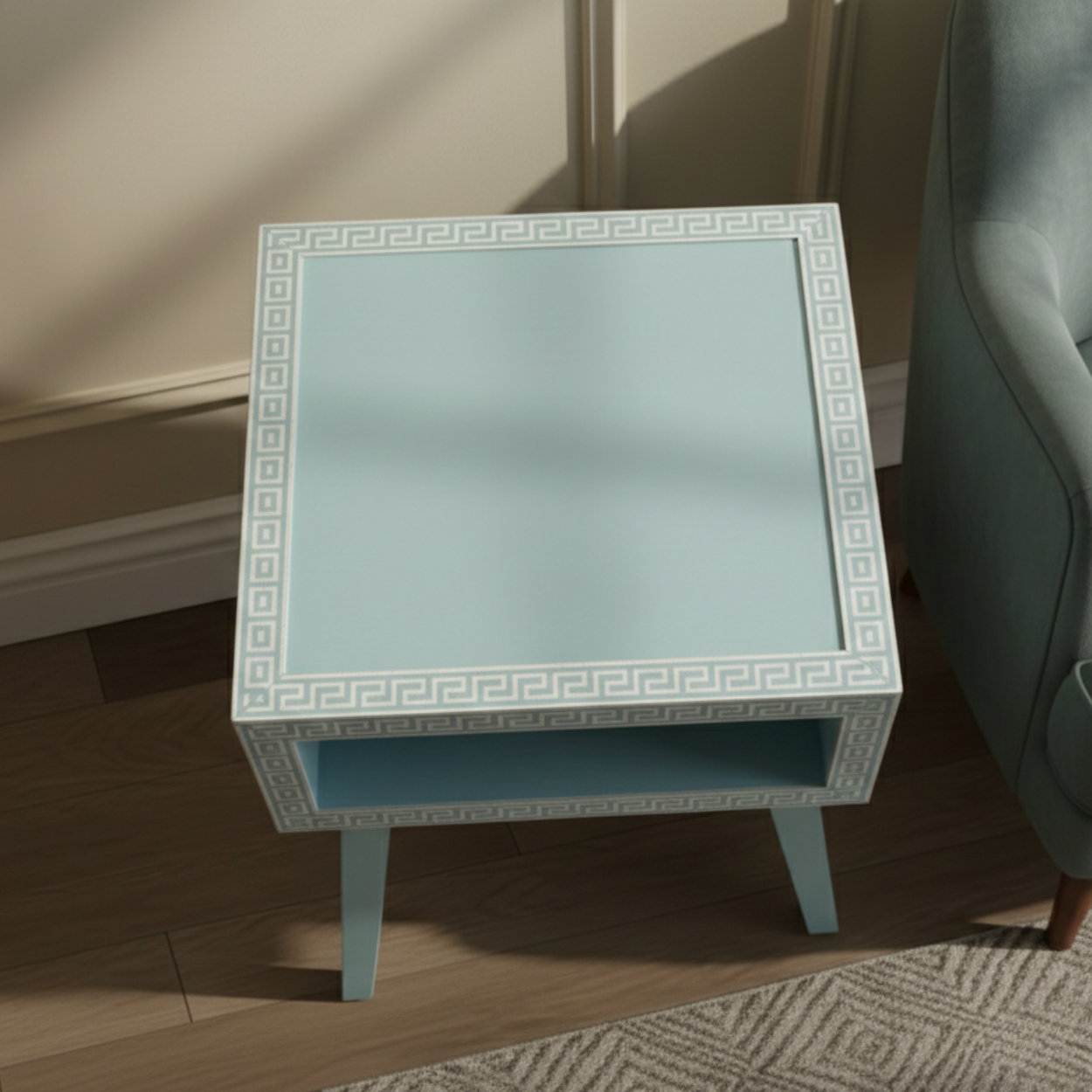 Bone Inlay Blue Bedside Table