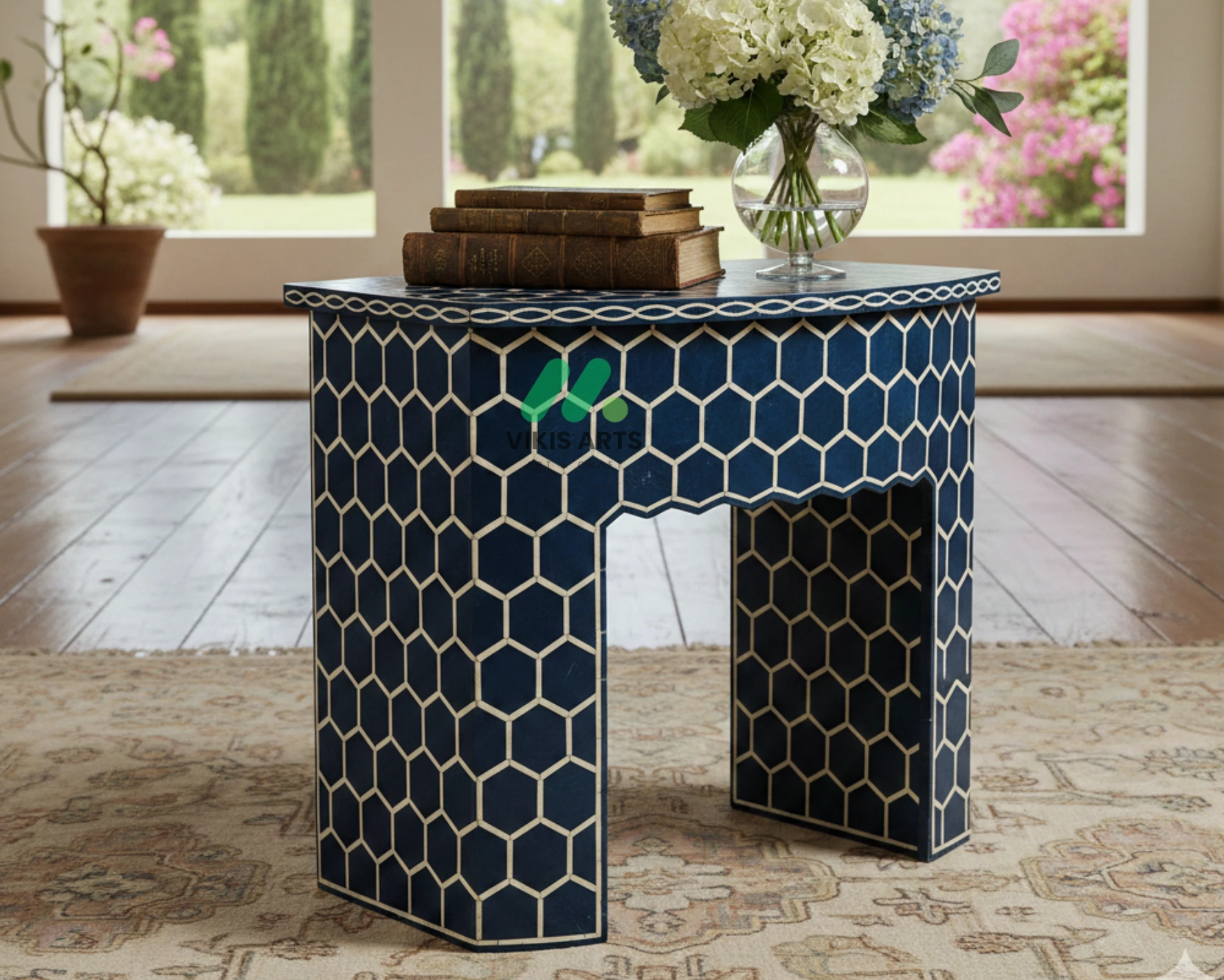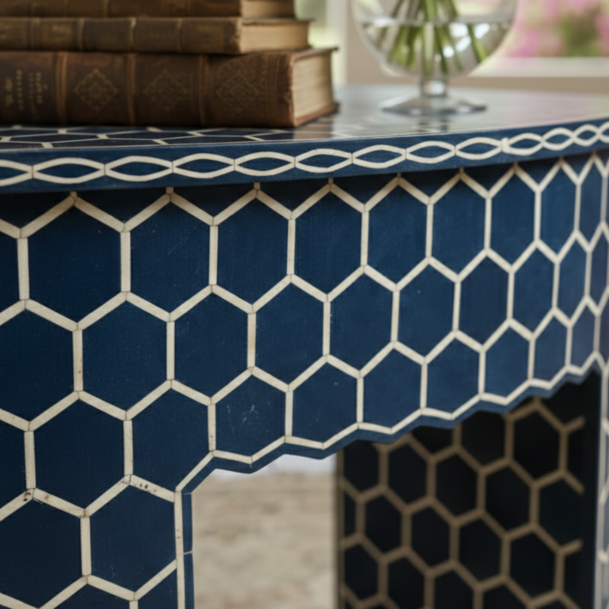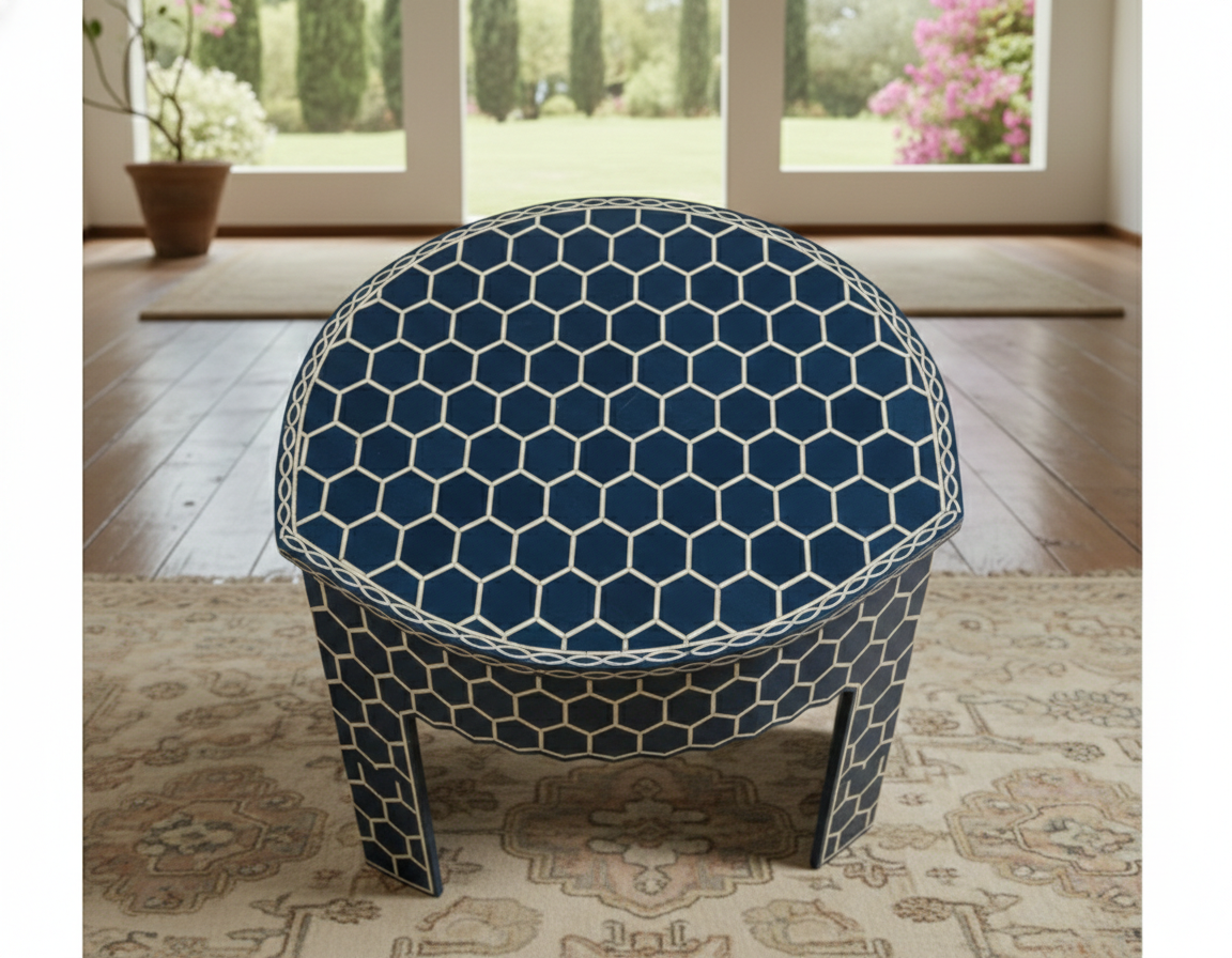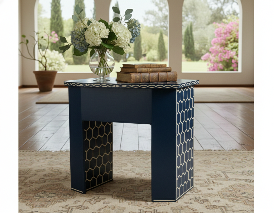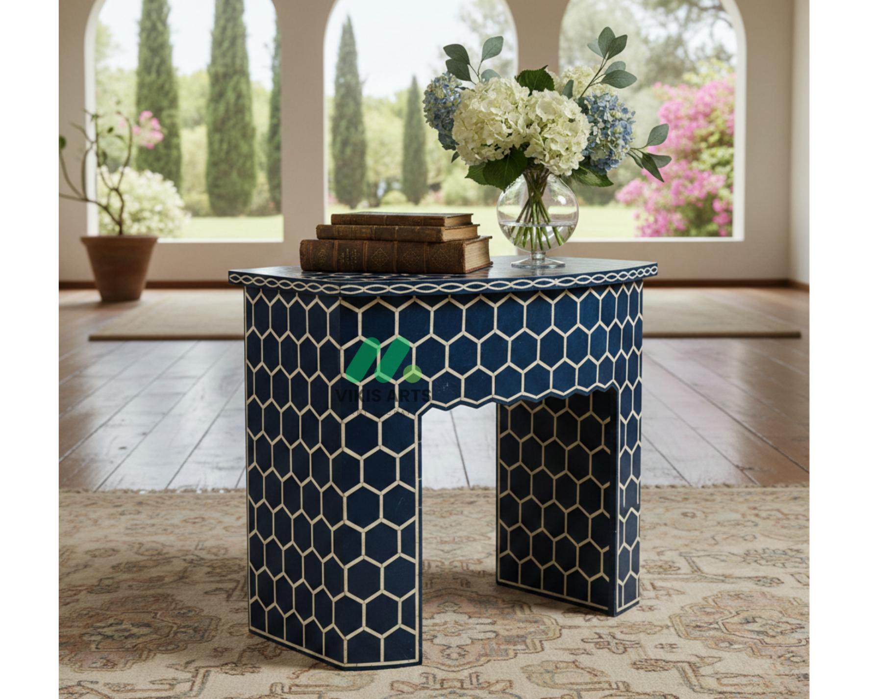 Add timeless elegance to your bedroom with this handcrafted Bone Inlay Bedside Table. Meticulously made by skilled artisans, each piece features intricate bone inlay patterns set into a sturdy wooden frame, creating a striking blend of traditional craftsmanship and contemporary design. The smooth tabletop offers ample space for lamps, books, or décor, while the drawer and shelf provide convenient storage for everyday essentials. Finished with fine detailing and a polished surface, this bedside table is both functional and a statement of luxury, making it a perfect addition to modern, classic, or eclectic interiors.