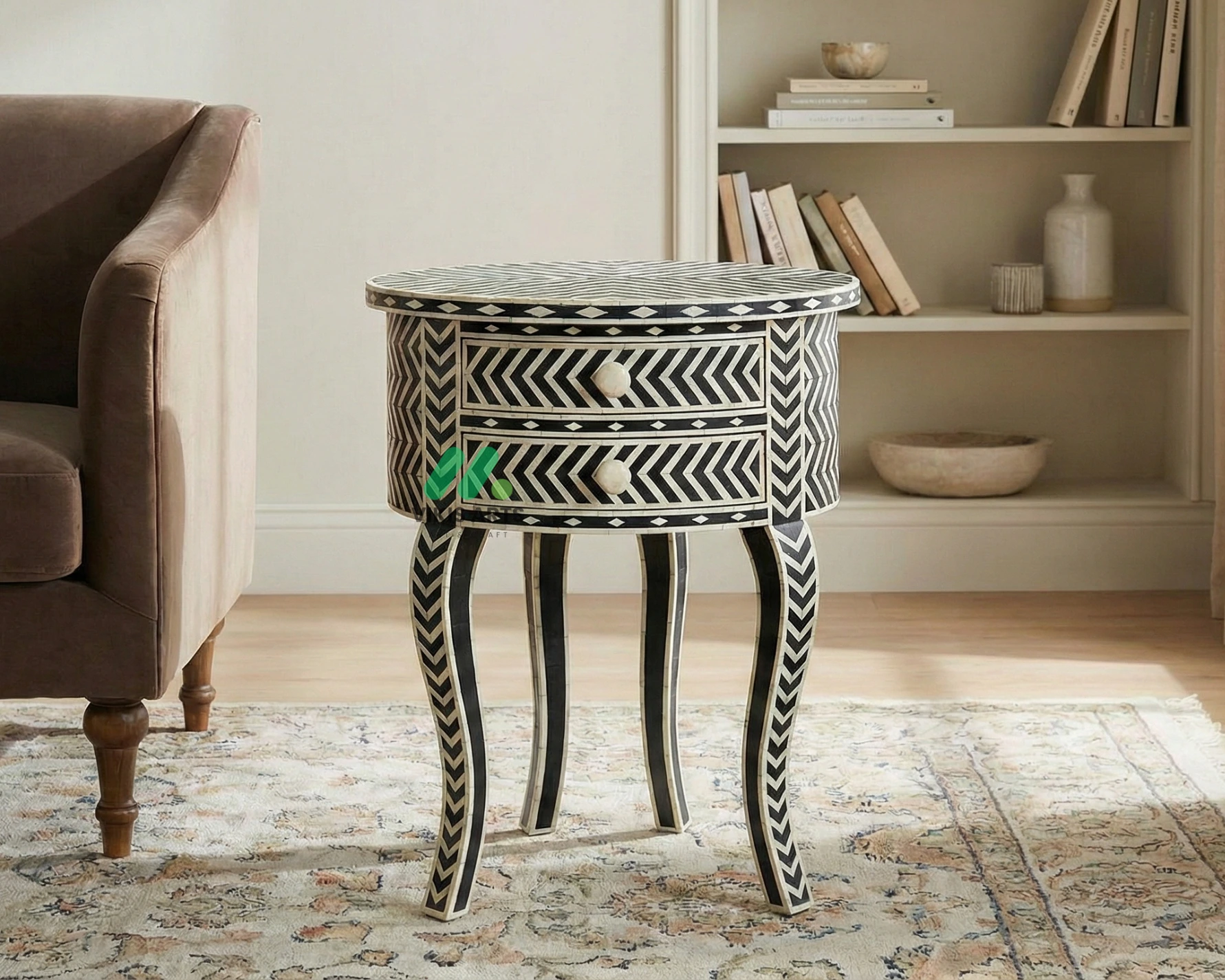 Add timeless elegance to your bedroom with this handcrafted Bone Inlay Bedside Table. Meticulously made by skilled artisans, each piece features intricate bone inlay patterns set into a sturdy wooden frame, creating a striking blend of traditional craftsmanship and contemporary design. The smooth tabletop offers ample space for lamps, books, or décor, while the drawer and shelf provide convenient storage for everyday essentials. Finished with fine detailing and a polished surface, this bedside table is both functional and a statement of luxury, making it a perfect addition to modern, classic, or eclectic interiors.
