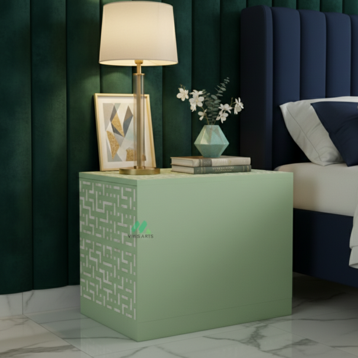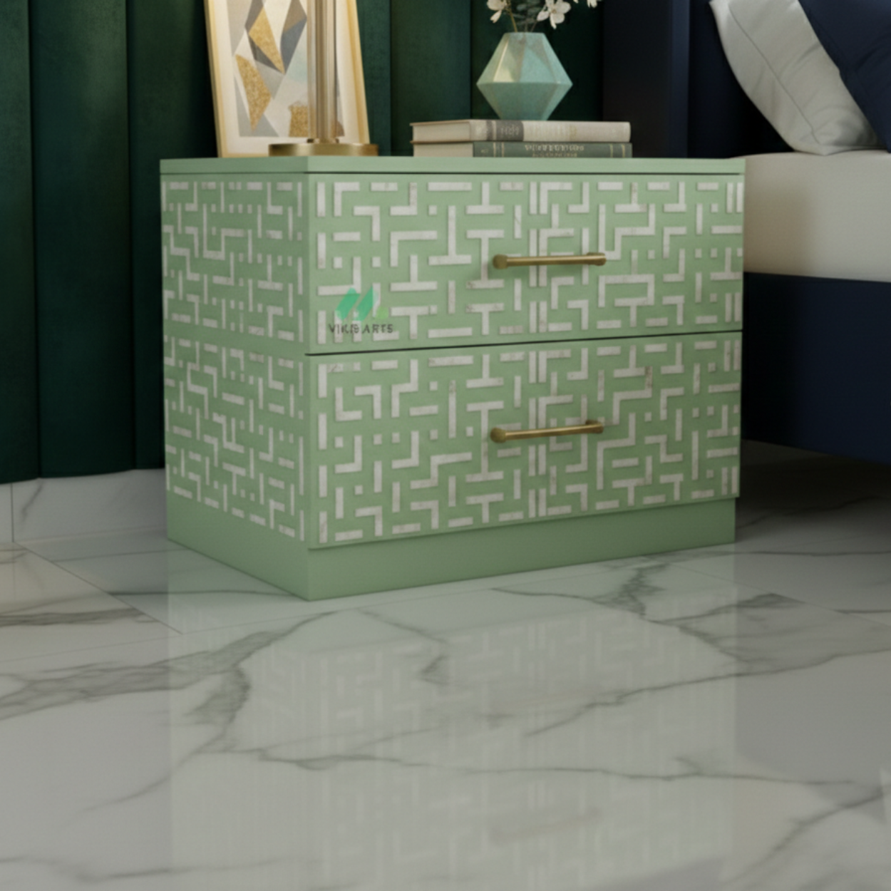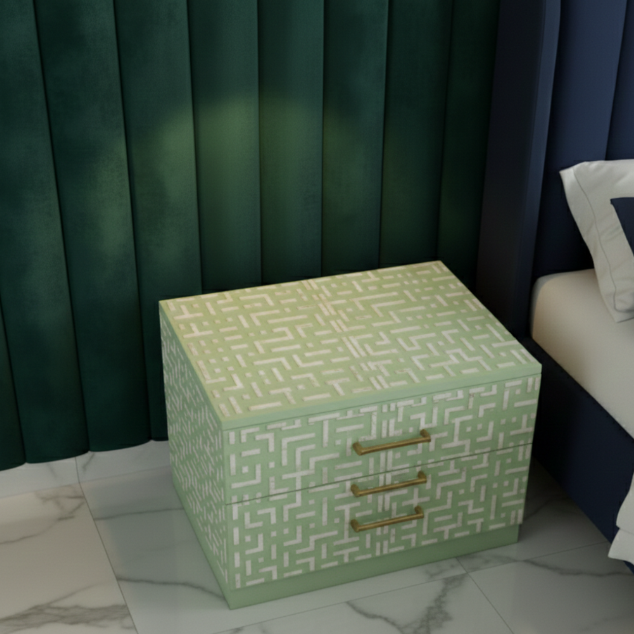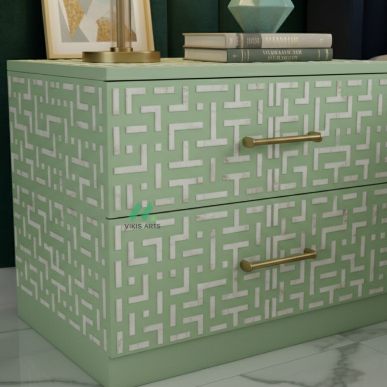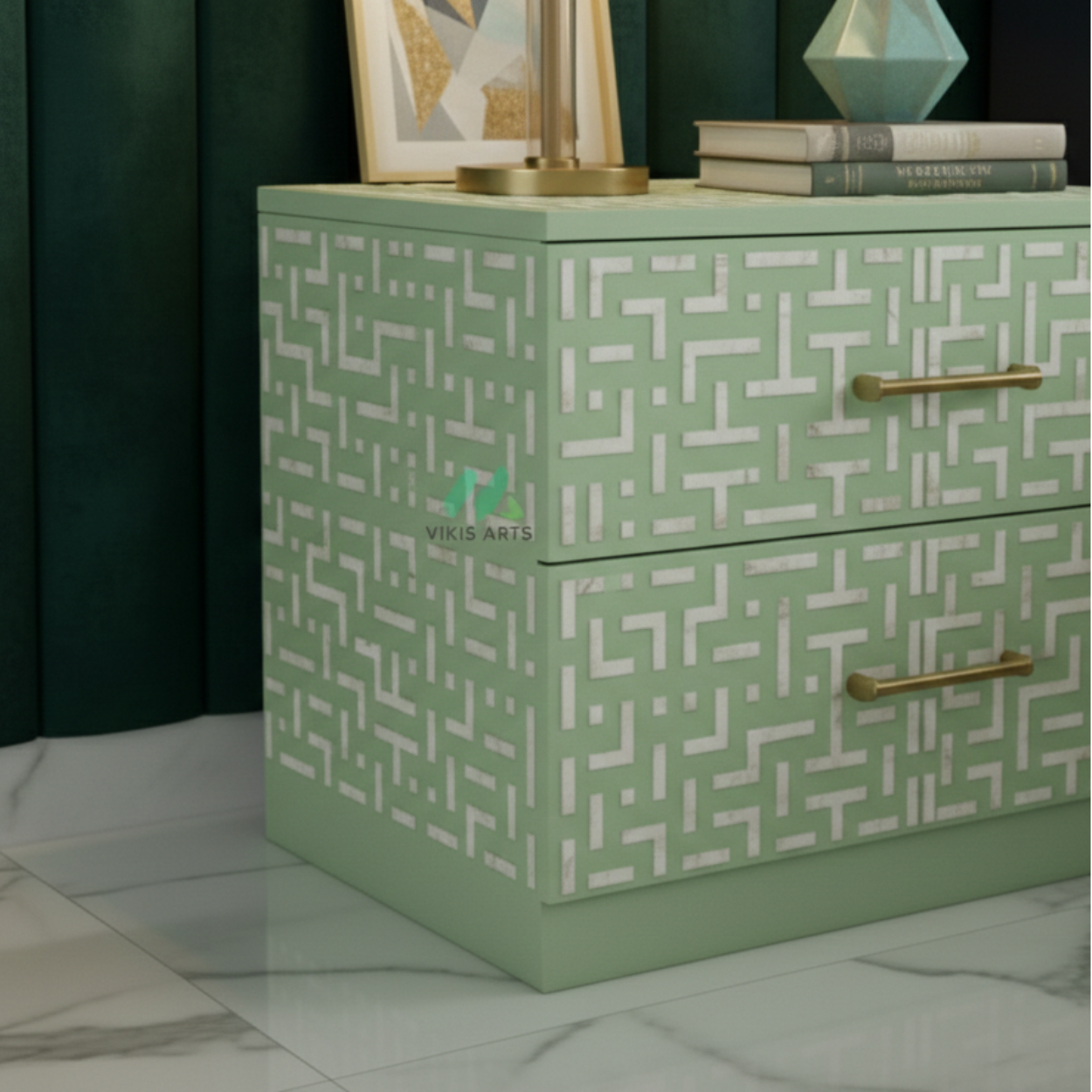 Add timeless elegance to your bedroom with this handcrafted Bone Inlay Bedside Table. Meticulously made by skilled artisans, each piece features intricate bone inlay patterns set into a sturdy wooden frame, creating a striking blend of traditional craftsmanship and contemporary design. The smooth tabletop offers ample space for lamps, books, or décor, while the drawer and shelf provide convenient storage for everyday essentials. Finished with fine detailing and a polished surface, this bedside table is both functional and a statement of luxury, making it a perfect addition to modern, classic, or eclectic interiors.