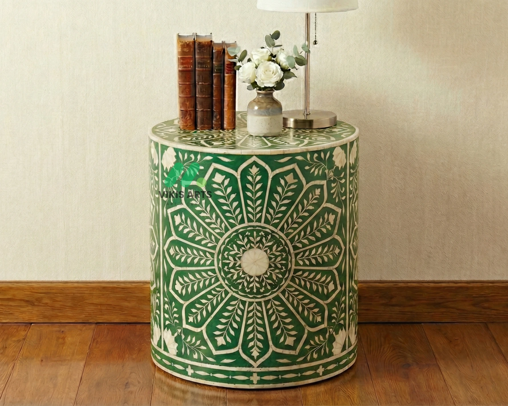 Bone inlay Green Round bedside table
