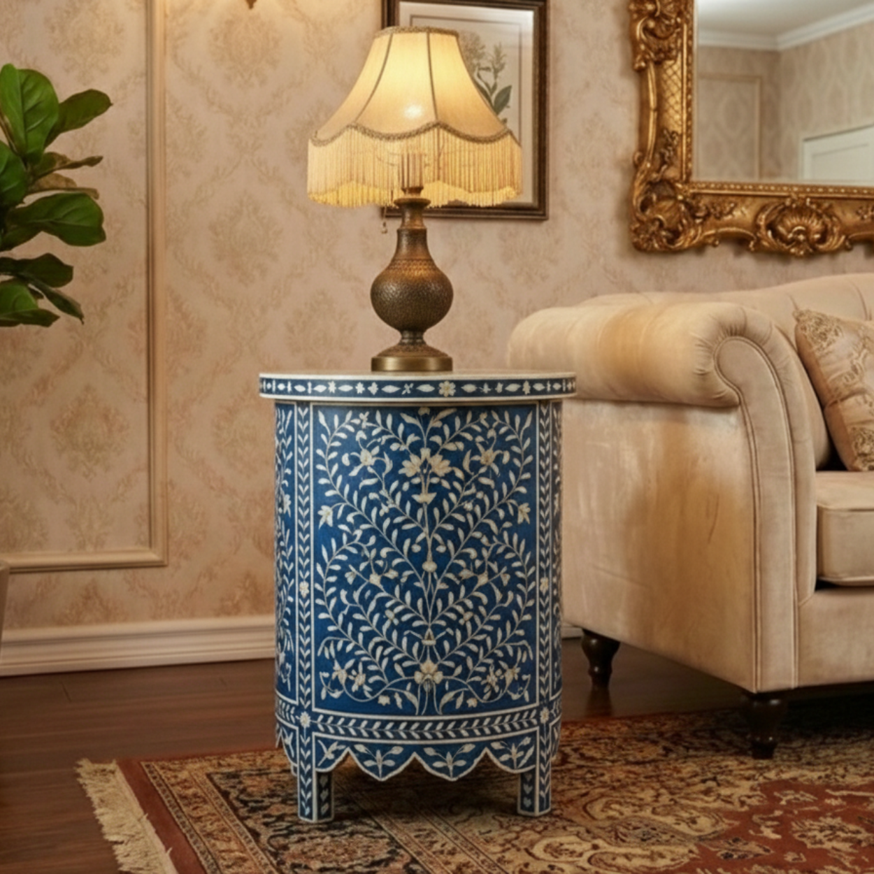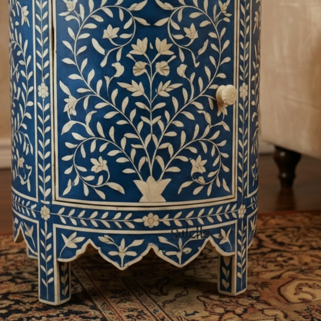 Add timeless elegance to your bedroom with this handcrafted Bone Inlay Bedside Table. Meticulously made by skilled artisans, each piece features intricate bone inlay patterns set into a sturdy wooden frame, creating a striking blend of traditional craftsmanship and contemporary design. The smooth tabletop offers ample space for lamps, books, or décor, while the drawer and shelf provide convenient storage for everyday essentials. Finished with fine detailing and a polished surface, this bedside table is both functional and a statement of luxury, making it a perfect addition to modern, classic, or eclectic interiors.