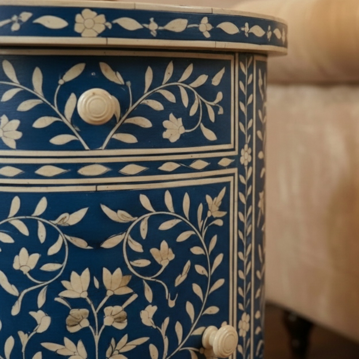 Bone inlay Round Blue bedside table with 2 Drawers