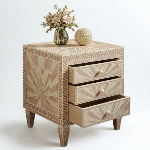 Add timeless elegance to your bedroom with this handcrafted Bone Inlay Bedside Table. Meticulously made by skilled artisans, each piece features intricate bone inlay patterns set into a sturdy wooden frame, creating a striking blend of traditional craftsmanship and contemporary design. The smooth tabletop offers ample space for lamps, books, or décor, while the drawer and shelf provide convenient storage for everyday essentials. Finished with fine detailing and a polished surface, this bedside table is both functional and a statement of luxury, making it a perfect addition to modern, classic, or eclectic interiors.
