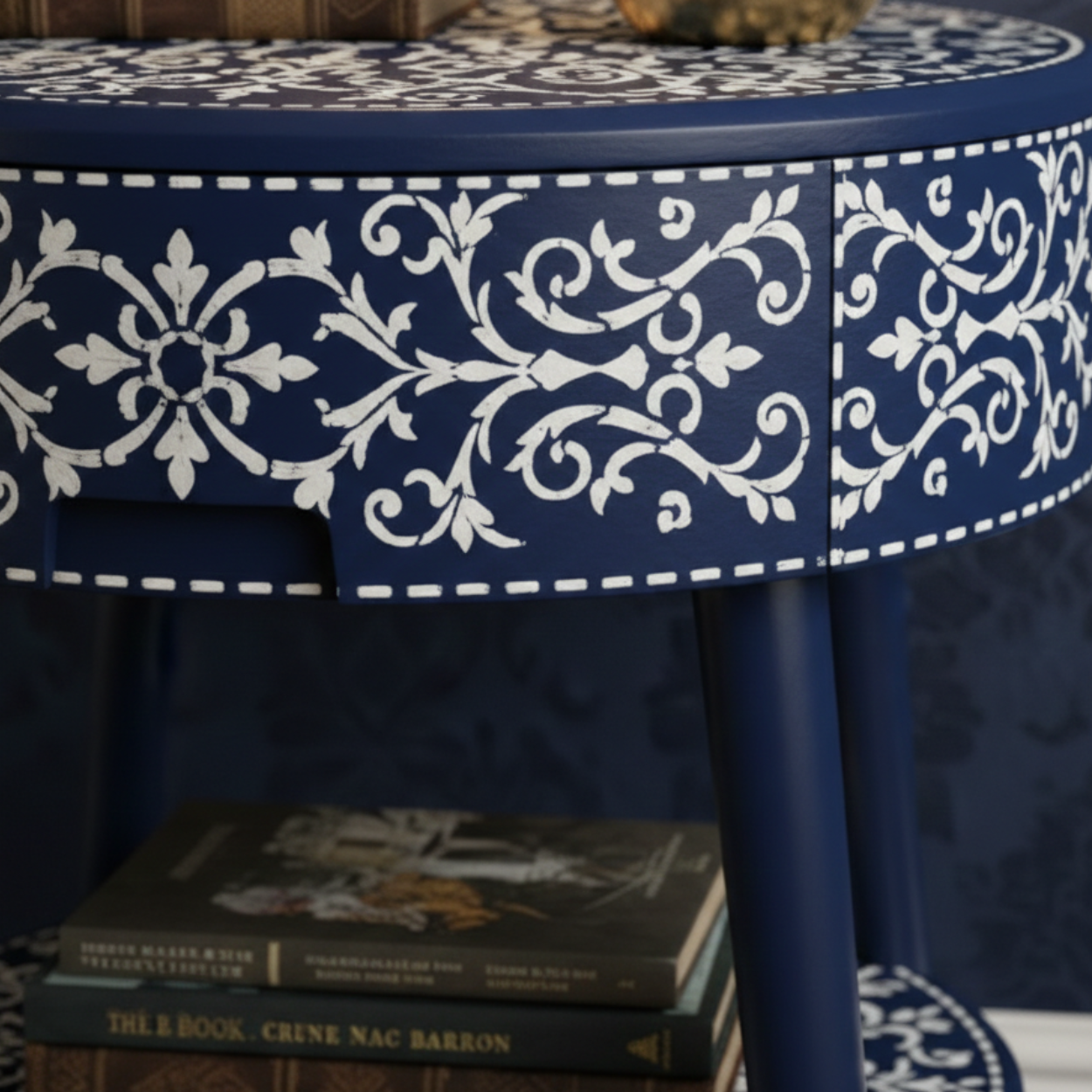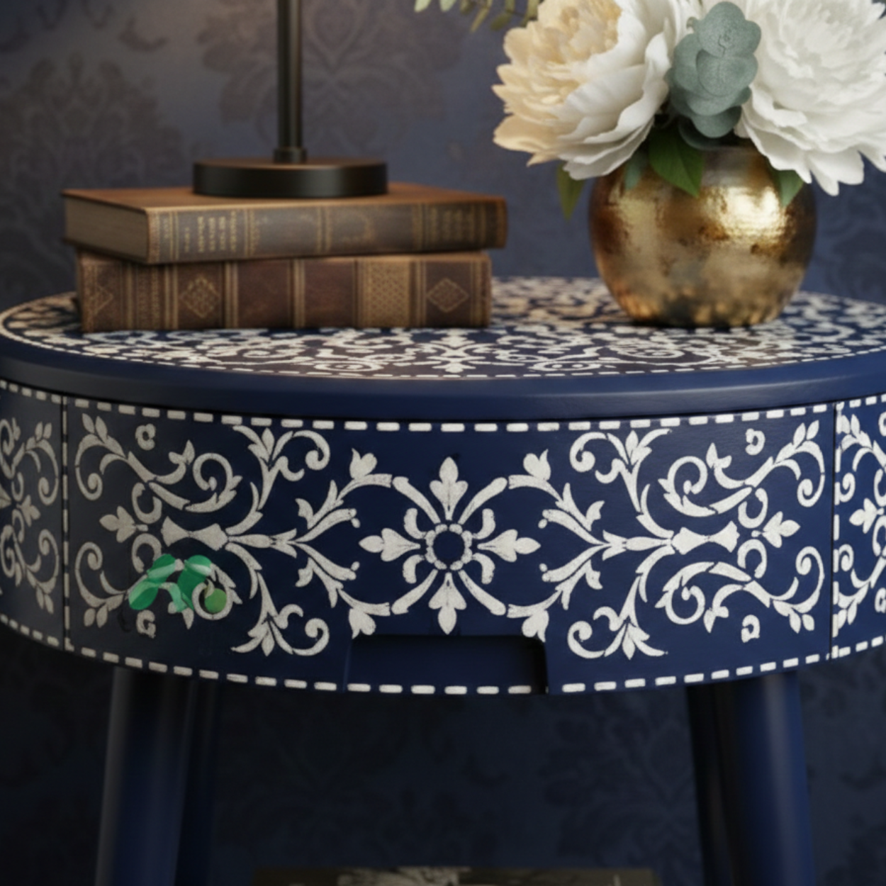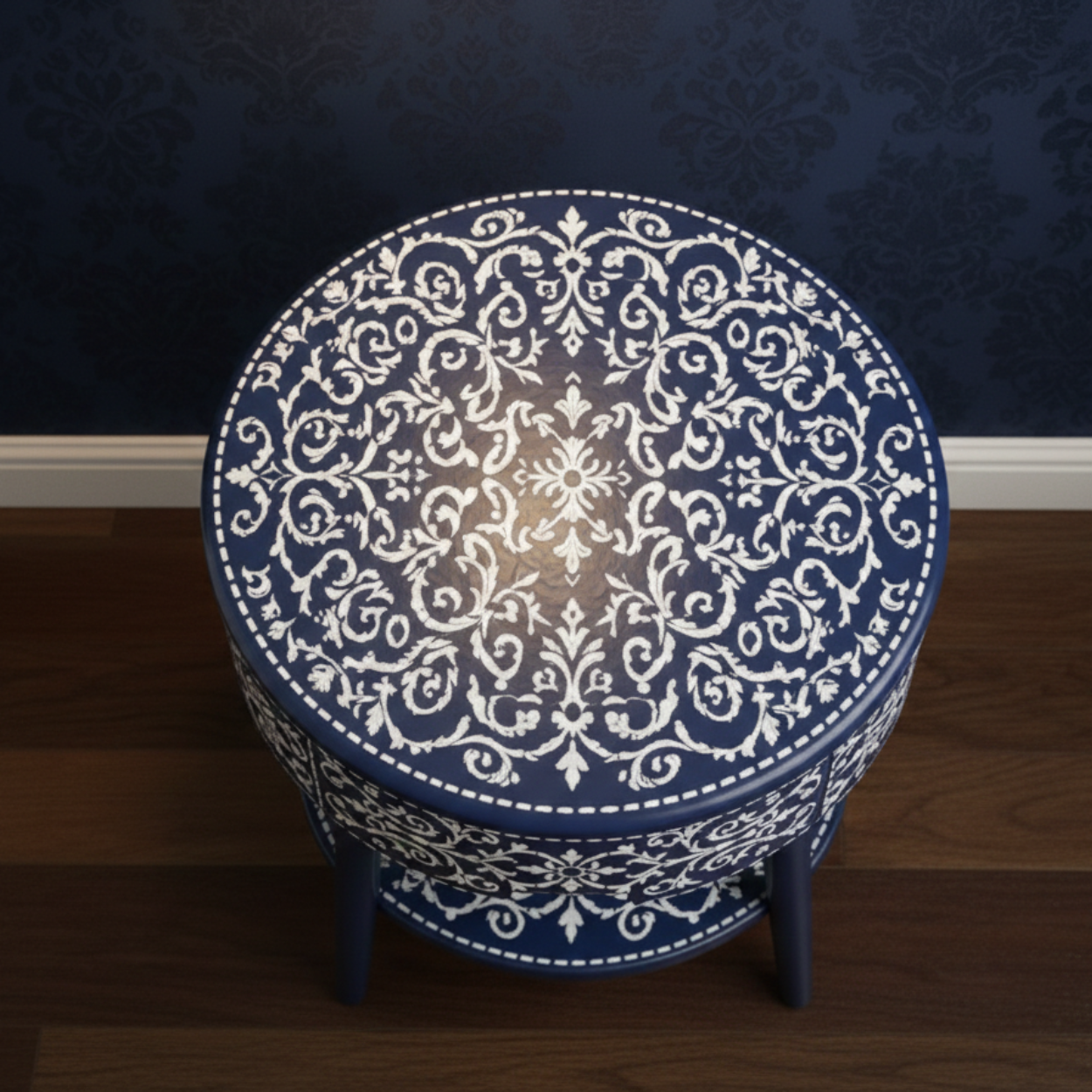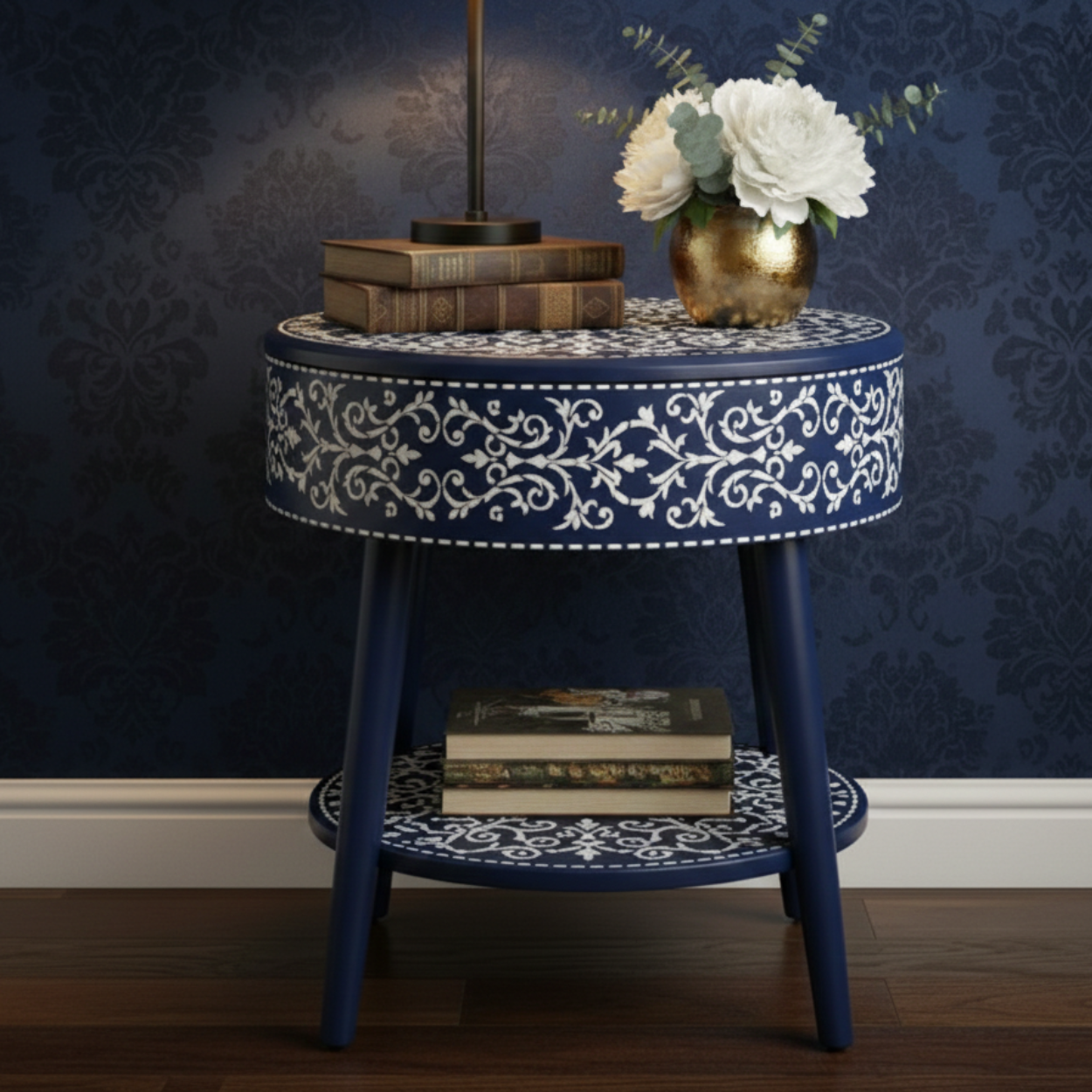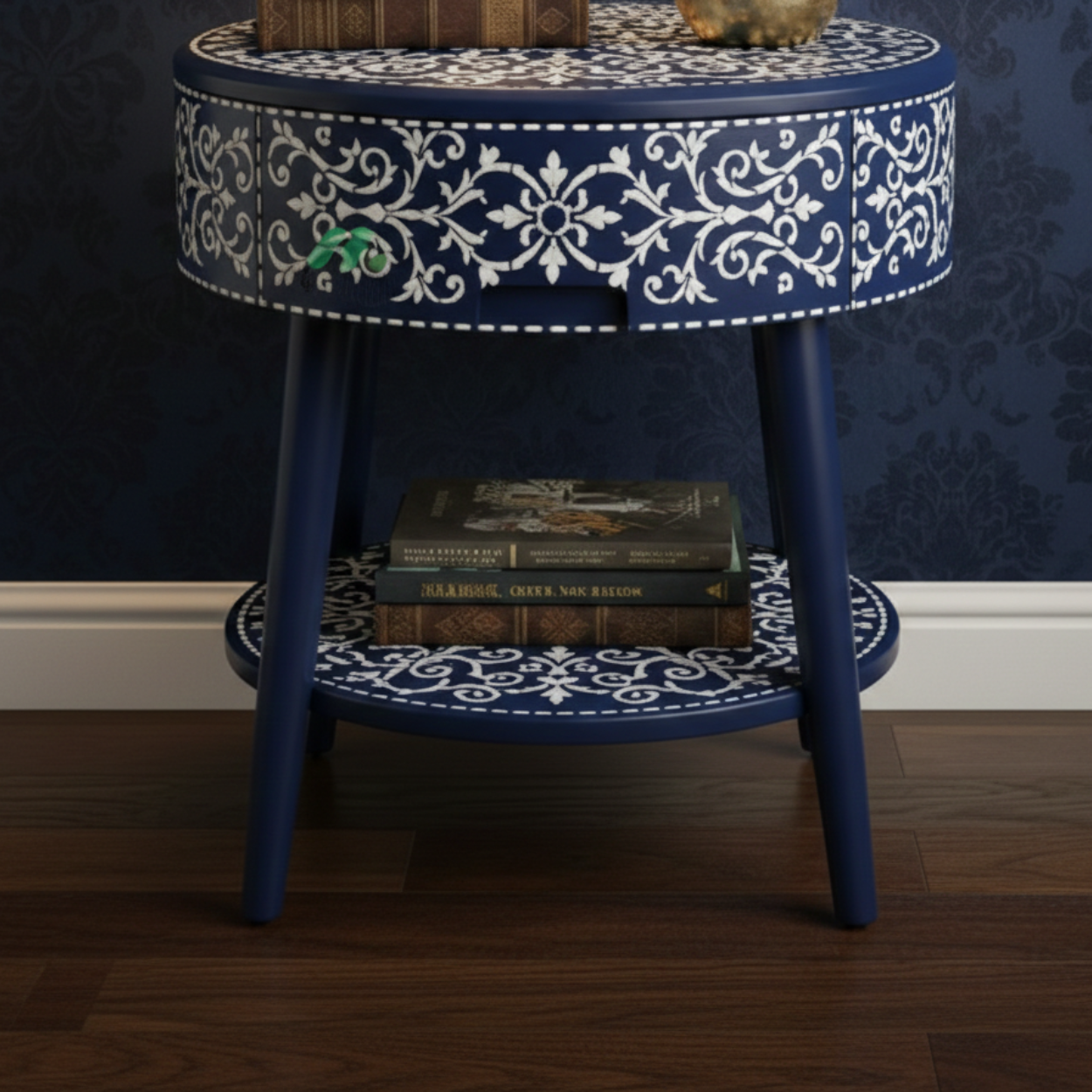 Bone Inlay Navy Blue Round Nightstand