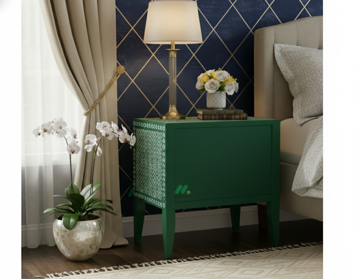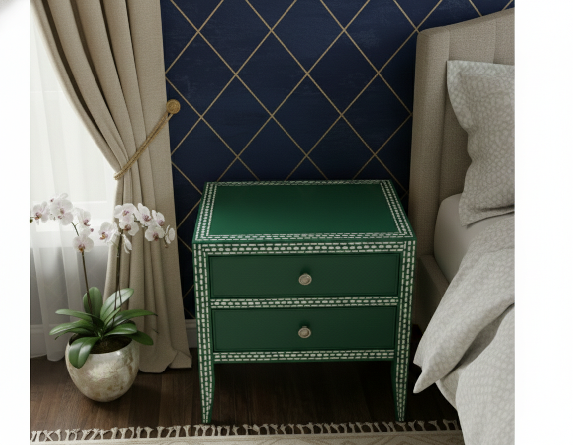 Add timeless elegance to your bedroom with this handcrafted Bone Inlay Bedside Table. Meticulously made by skilled artisans, each piece features intricate bone inlay patterns set into a sturdy wooden frame, creating a striking blend of traditional craftsmanship and contemporary design. The smooth tabletop offers ample space for lamps, books, or décor, while the drawer and shelf provide convenient storage for everyday essentials. Finished with fine detailing and a polished surface, this bedside table is both functional and a statement of luxury, making it a perfect addition to modern, classic, or eclectic interiors.