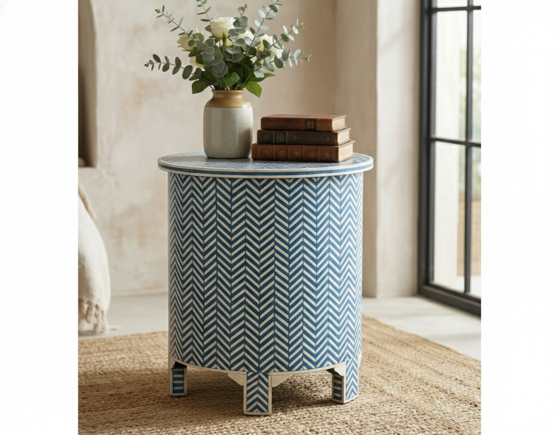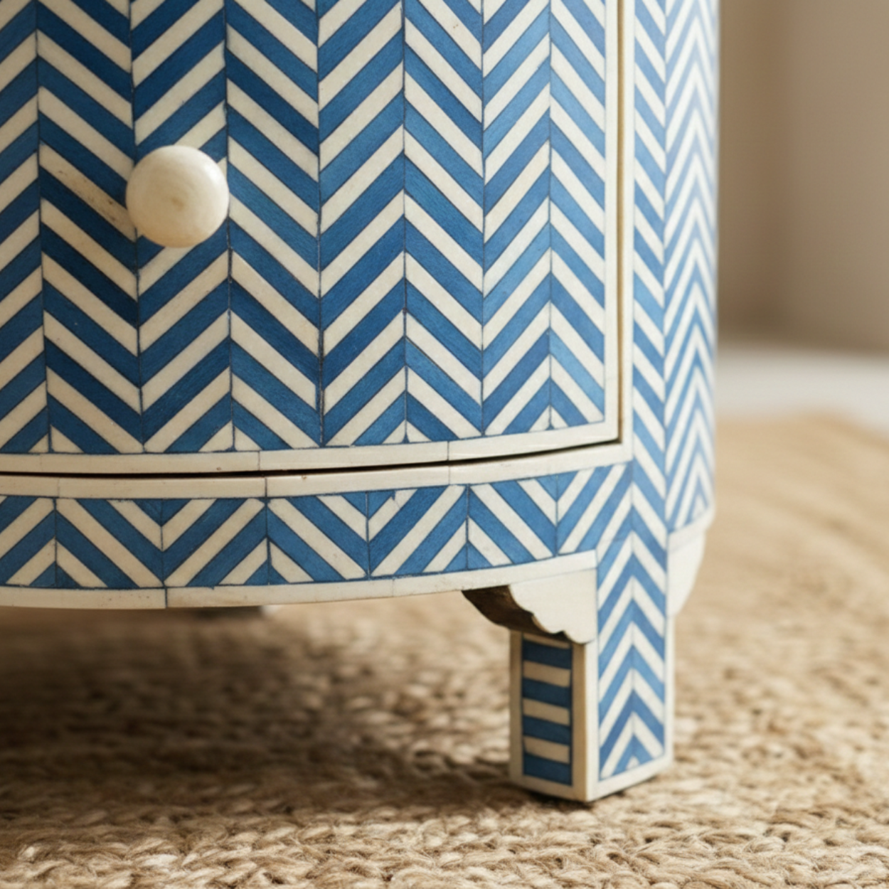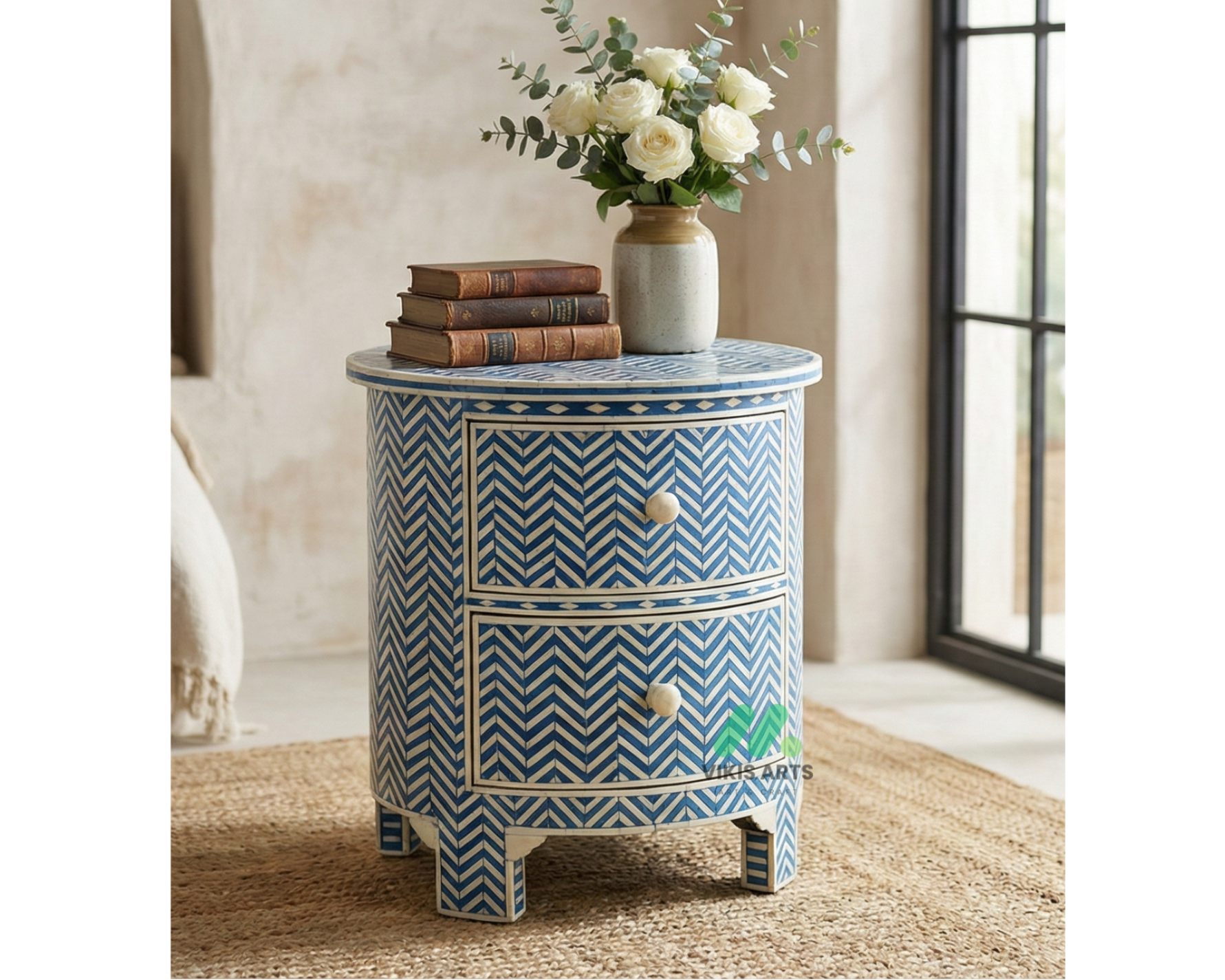Bone Inlay Blue Round bedside table with 2 Drawer