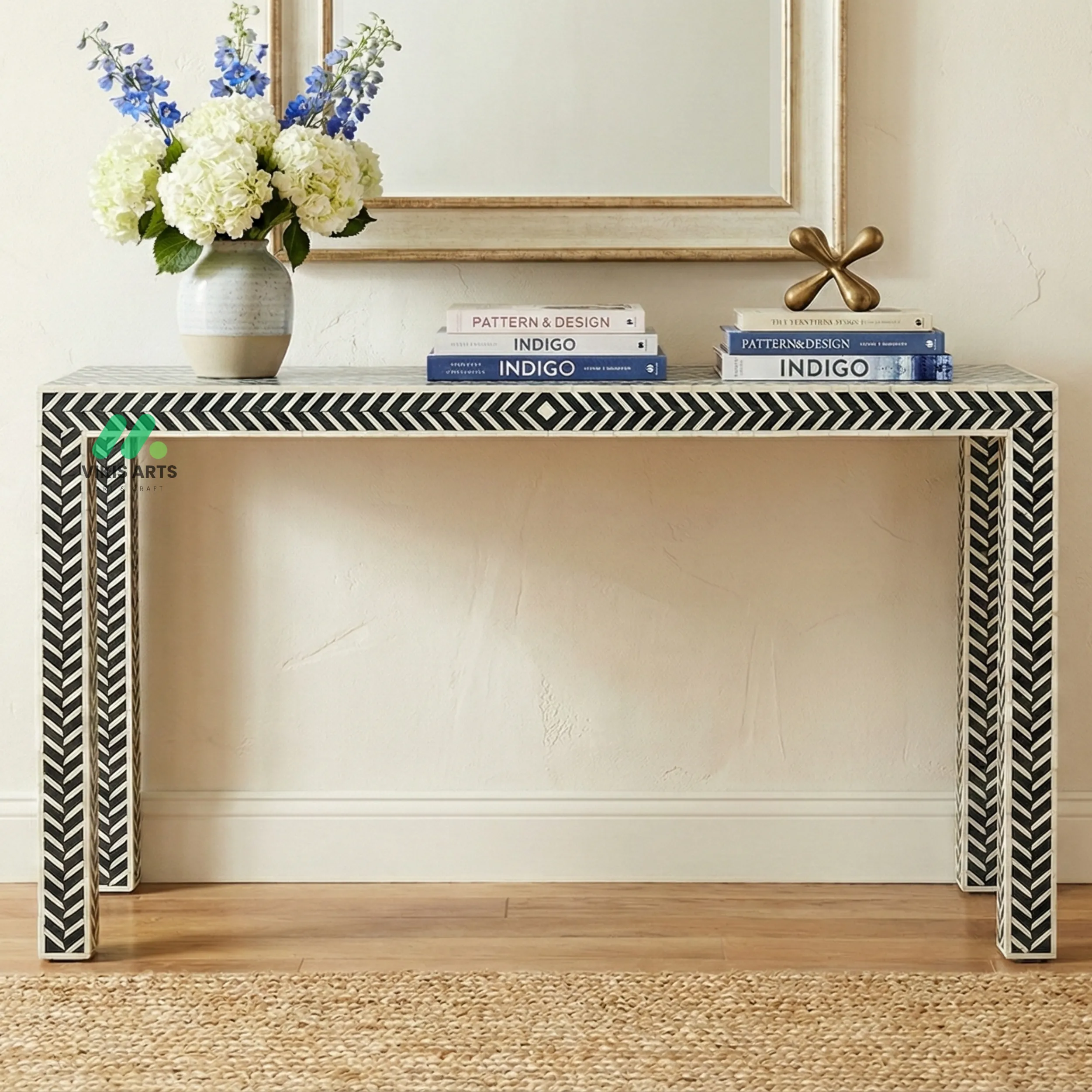 Enhance your interior with this stunning Bone Inlay Console Table, beautifully handcrafted by skilled artisans using traditional inlay techniques. Each piece features delicately carved bone inlaid into a solid wood base, forming intricate patterns that make every table truly unique.