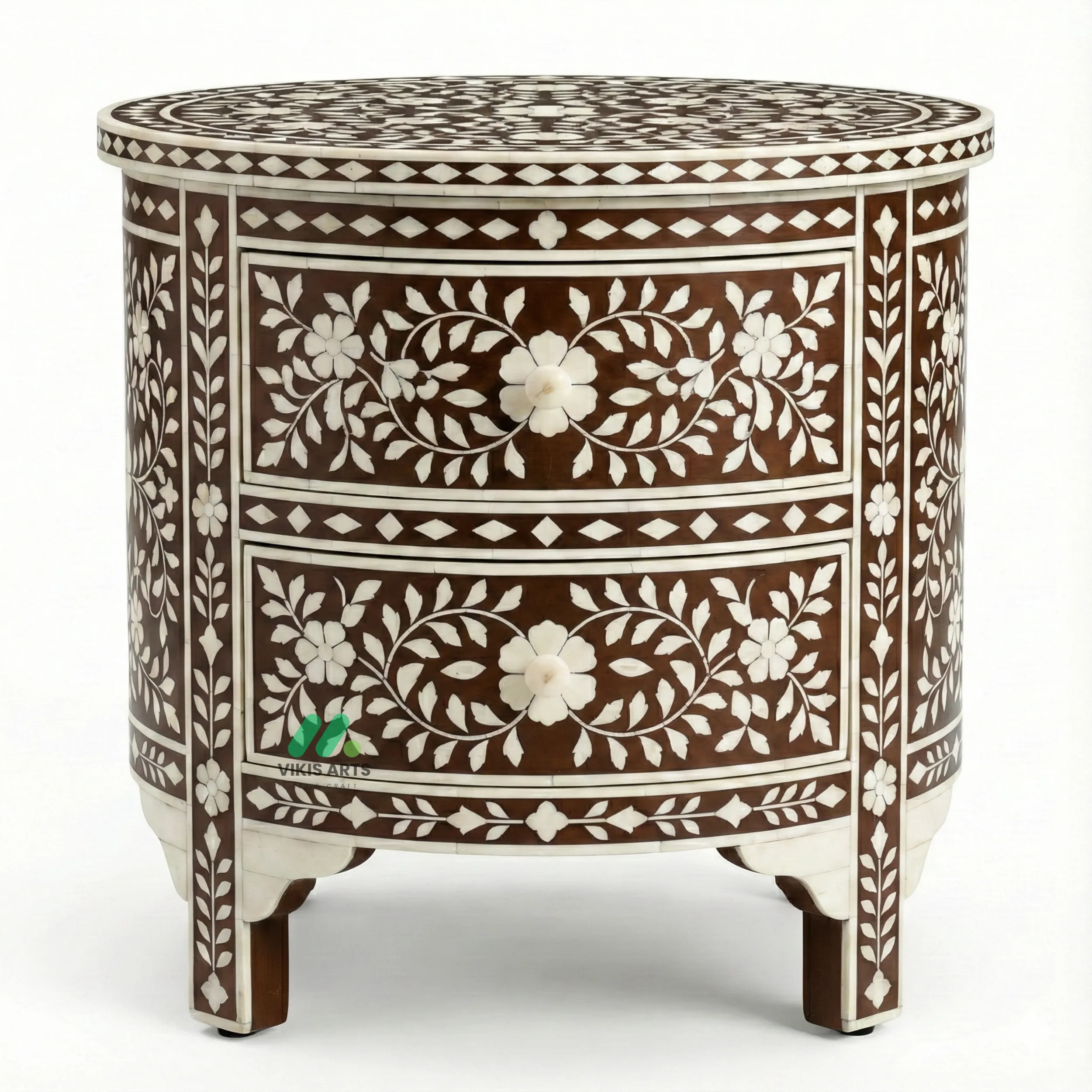 Bone inlay Brown round nightstand with 2 drawer.