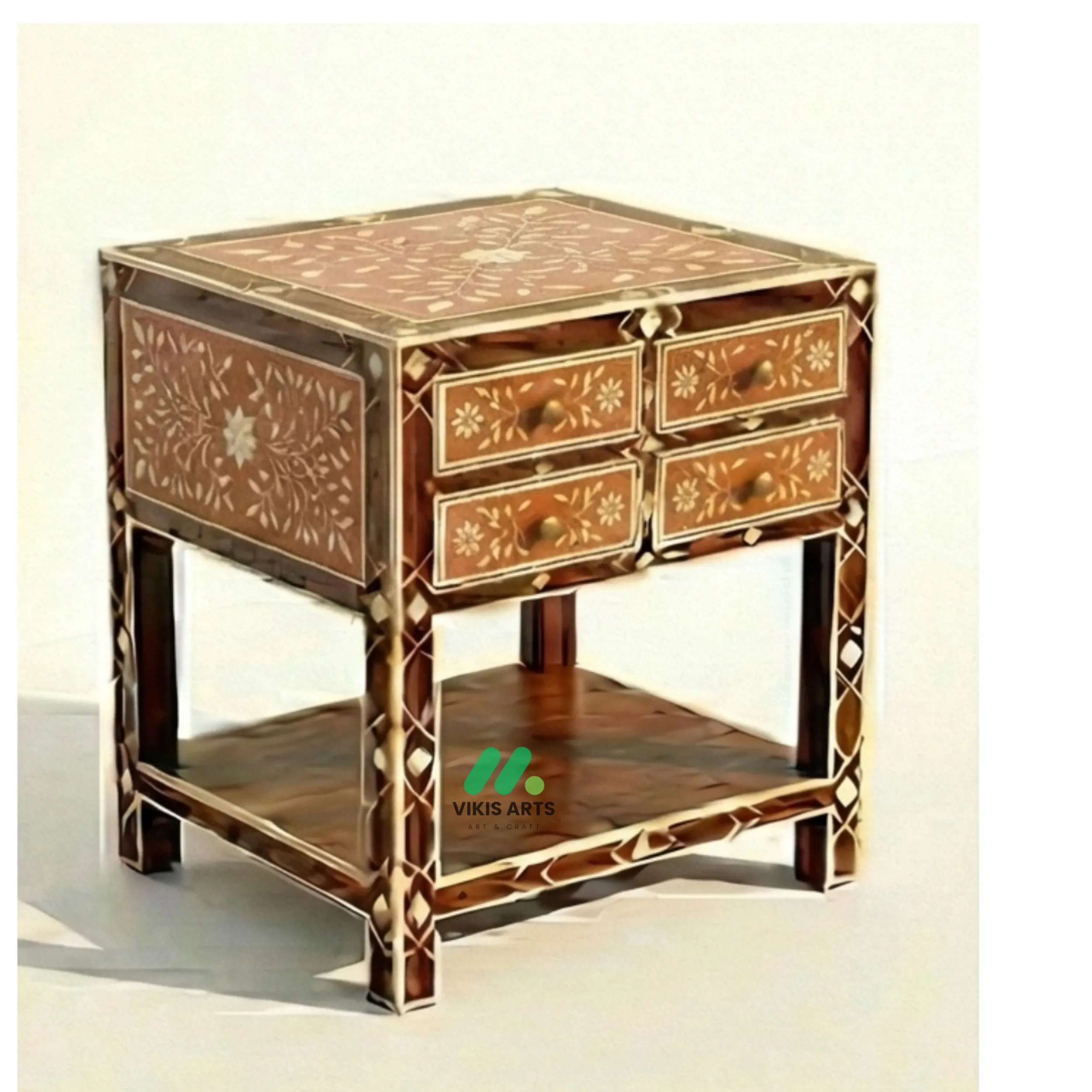 Enhance your living space with the timeless elegance of this handcrafted Bone Inlay 4 Chest of Drawers. Expertly created by skilled artisans, each piece features intricate bone inlay patterns delicately embedded into a solid wooden base, forming a stunning blend of traditional craftsmanship and contemporary design. The detailed motifs add depth, texture, and a luxurious visual appeal to any interior.