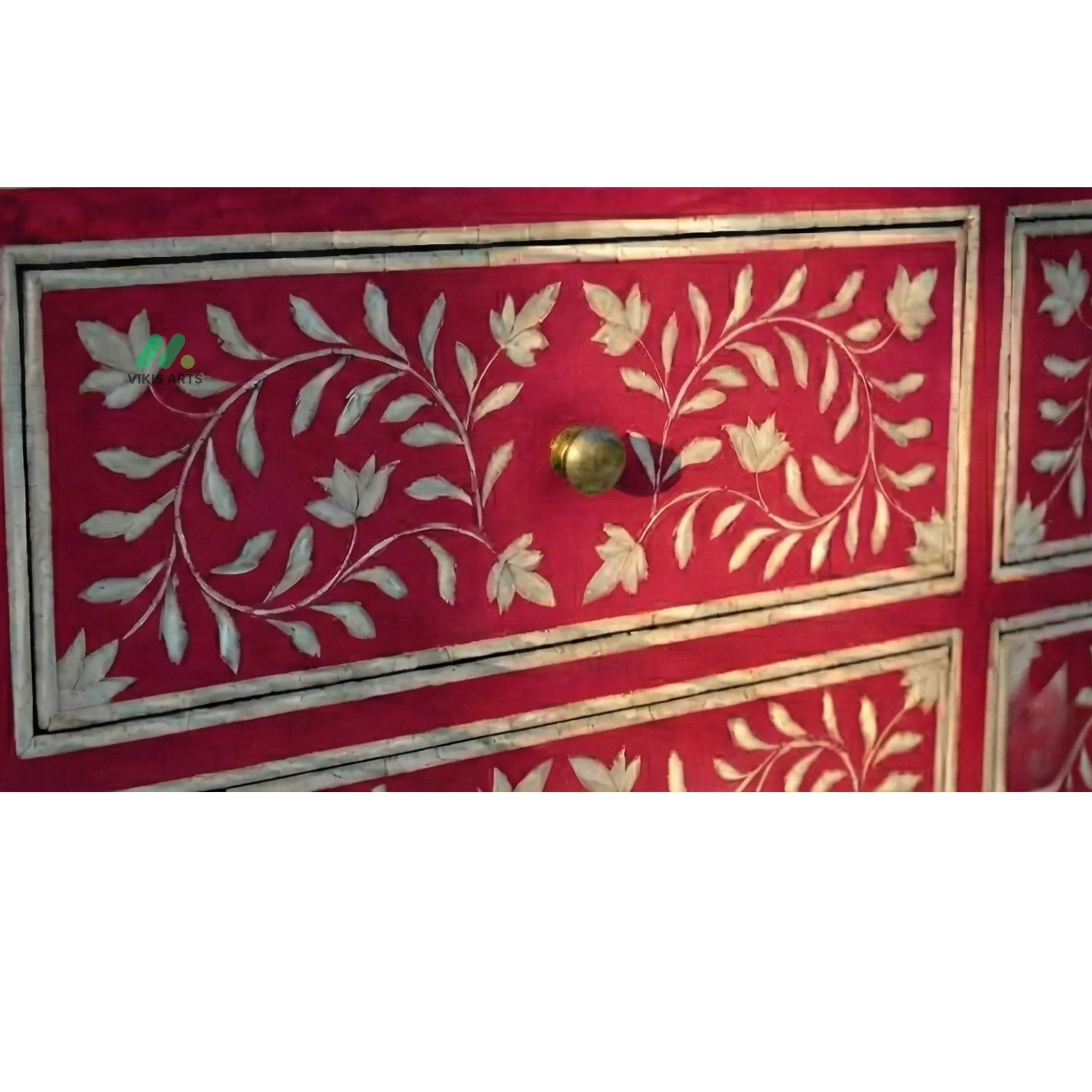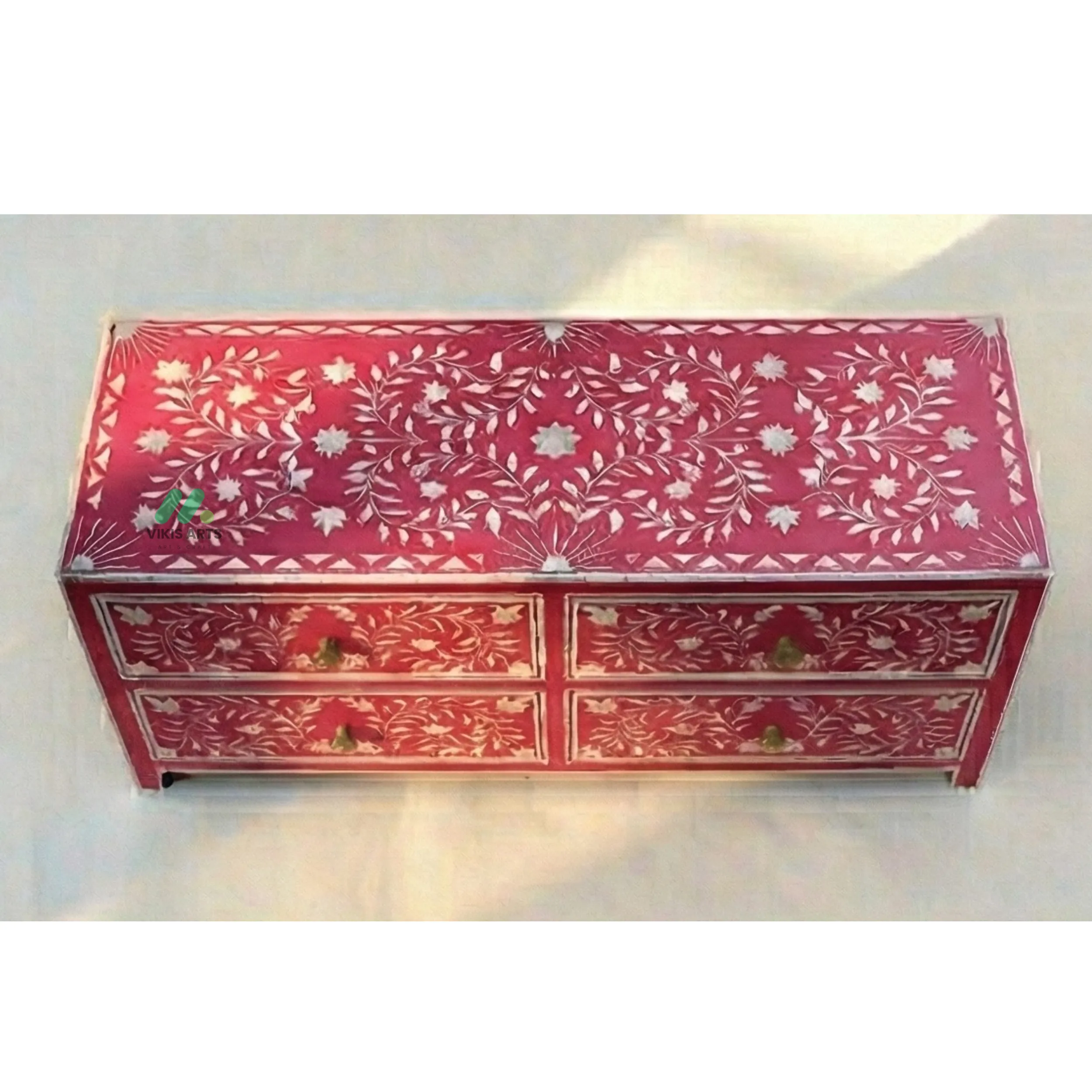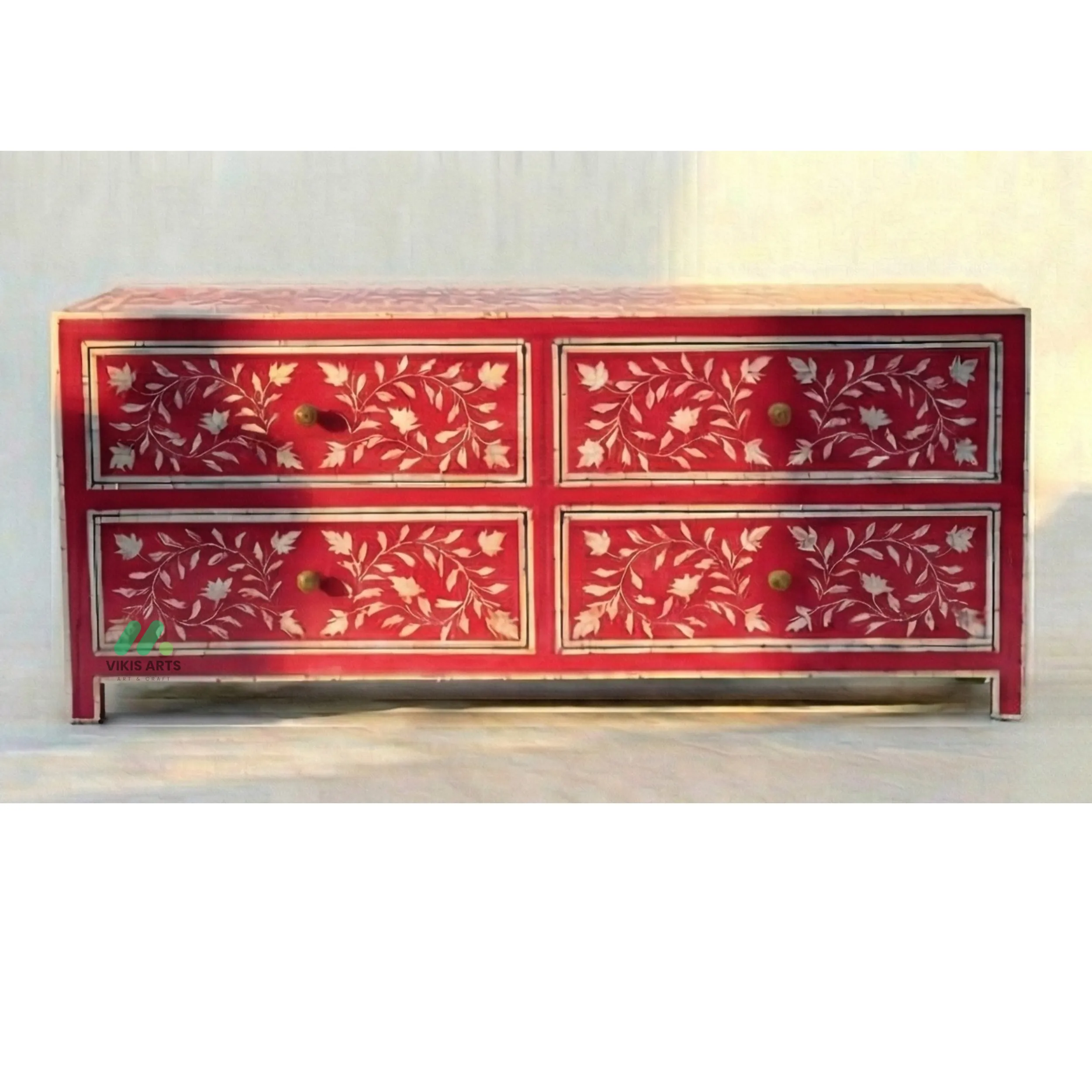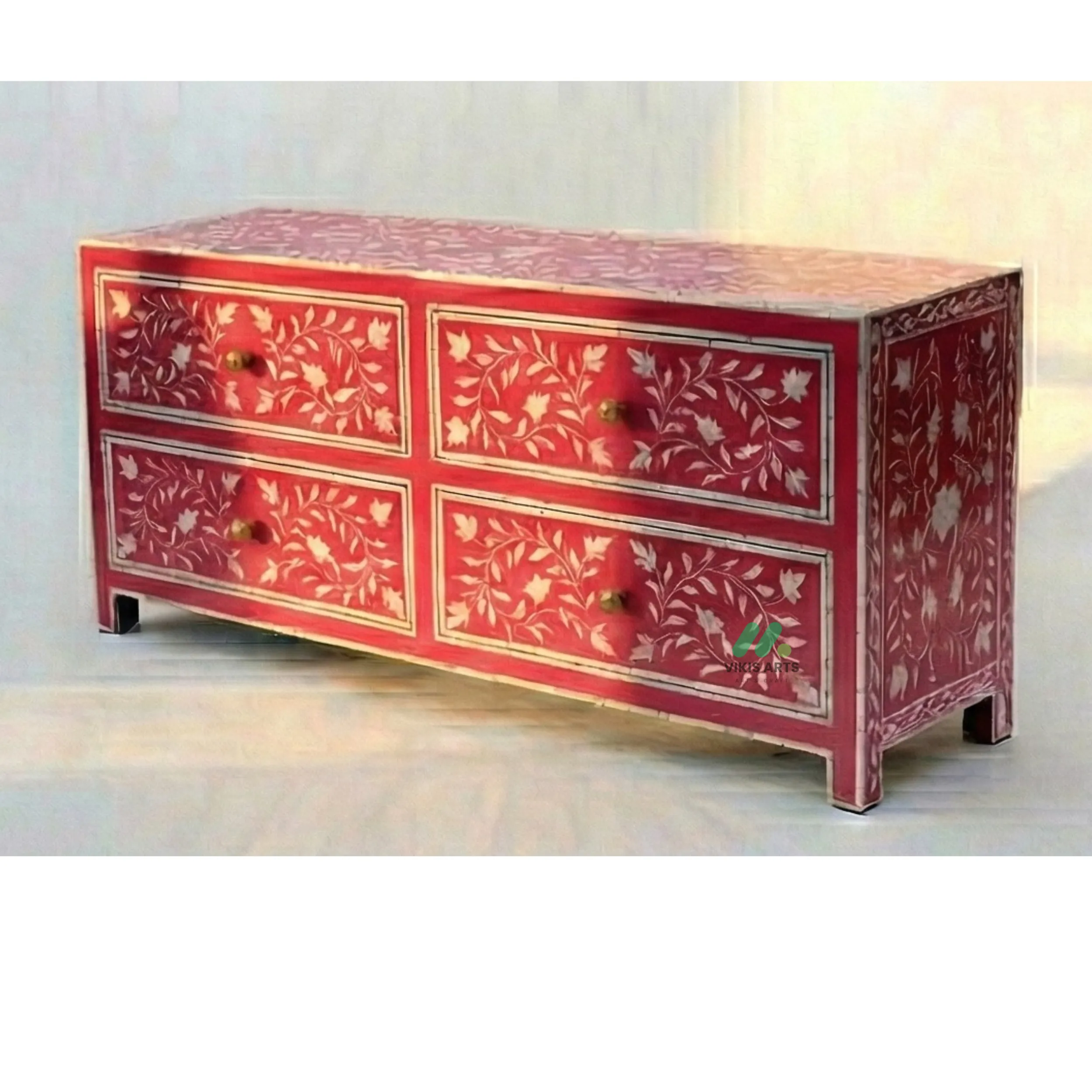 Elevate your interior with this stunning Bone Inlay 4 Chest of Drawers, a perfect blend of traditional craftsmanship and modern functionality. Handcrafted by skilled artisans, each drawer features intricate bone inlay patterns carefully embedded into a solid wooden frame, creating a visually striking and timeless design.