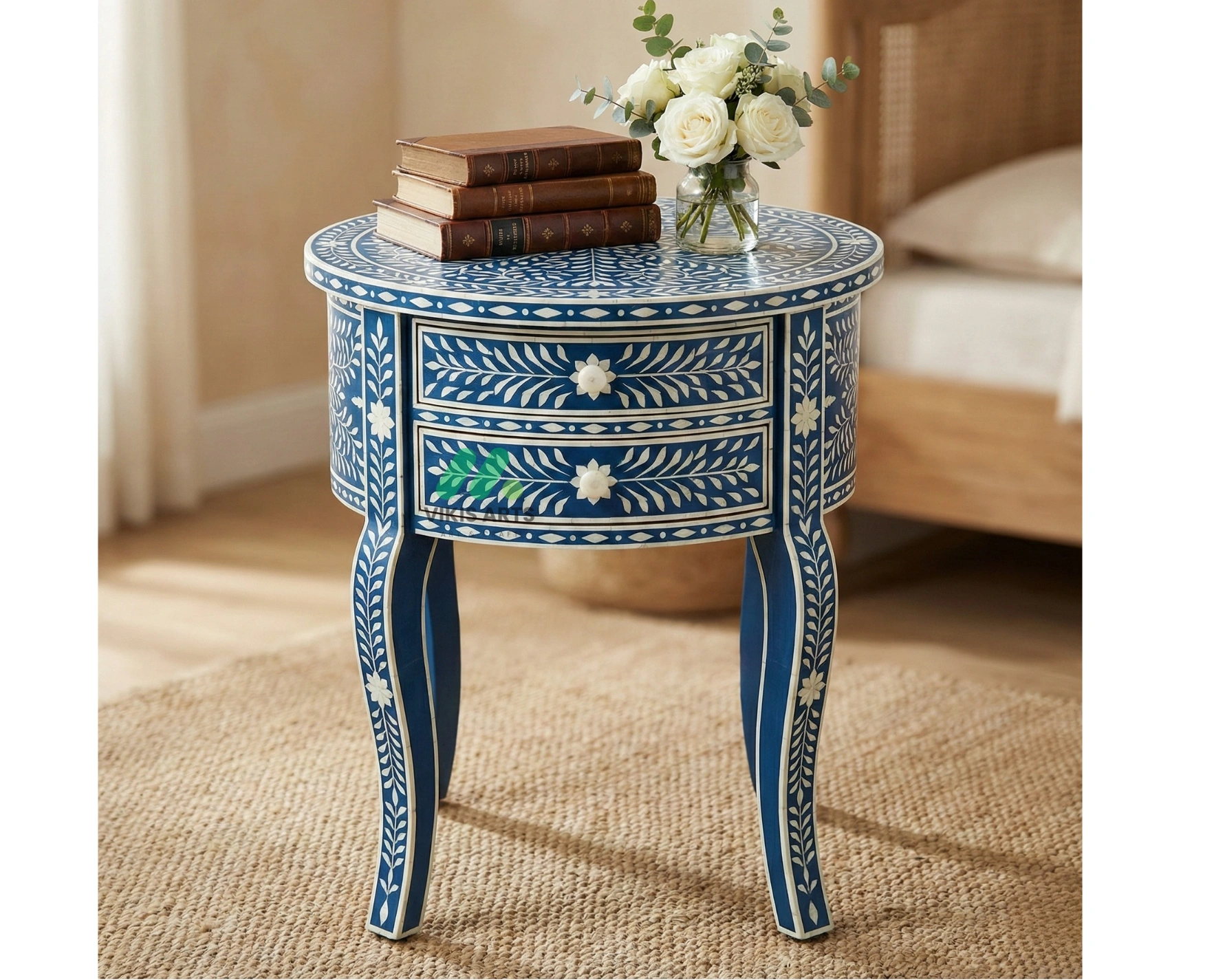 Bone Inlay Blue Round Bedside Table With 2 Drawers | Nightstand Table | Handmade Home Decor Perfect for holding a lamp, books, or nighttime essentials, it offers practical storage to keep your space organized and clutter-free. Its clean lines and versatile design allow it to complement modern, contemporary, and classic bedroom interiors with ease.