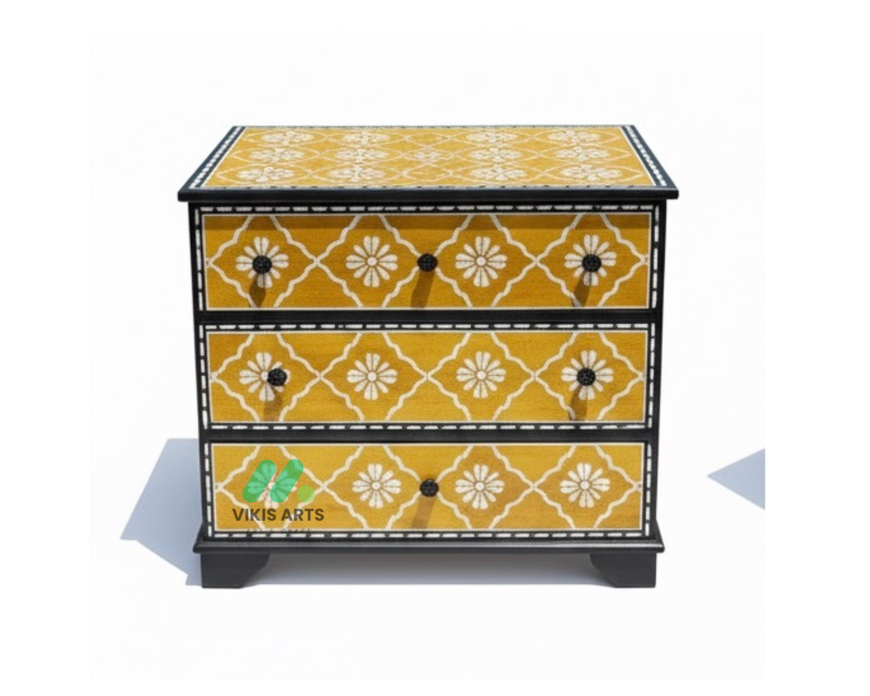 Elevate your interior with the timeless elegance of this handcrafted Bone Inlay 3 Chest of Drawer. Expertly made by skilled artisans, this beautiful piece showcases intricate bone inlay patterns set into a solid wooden base, reflecting exceptional craftsmanship and traditional artistry.