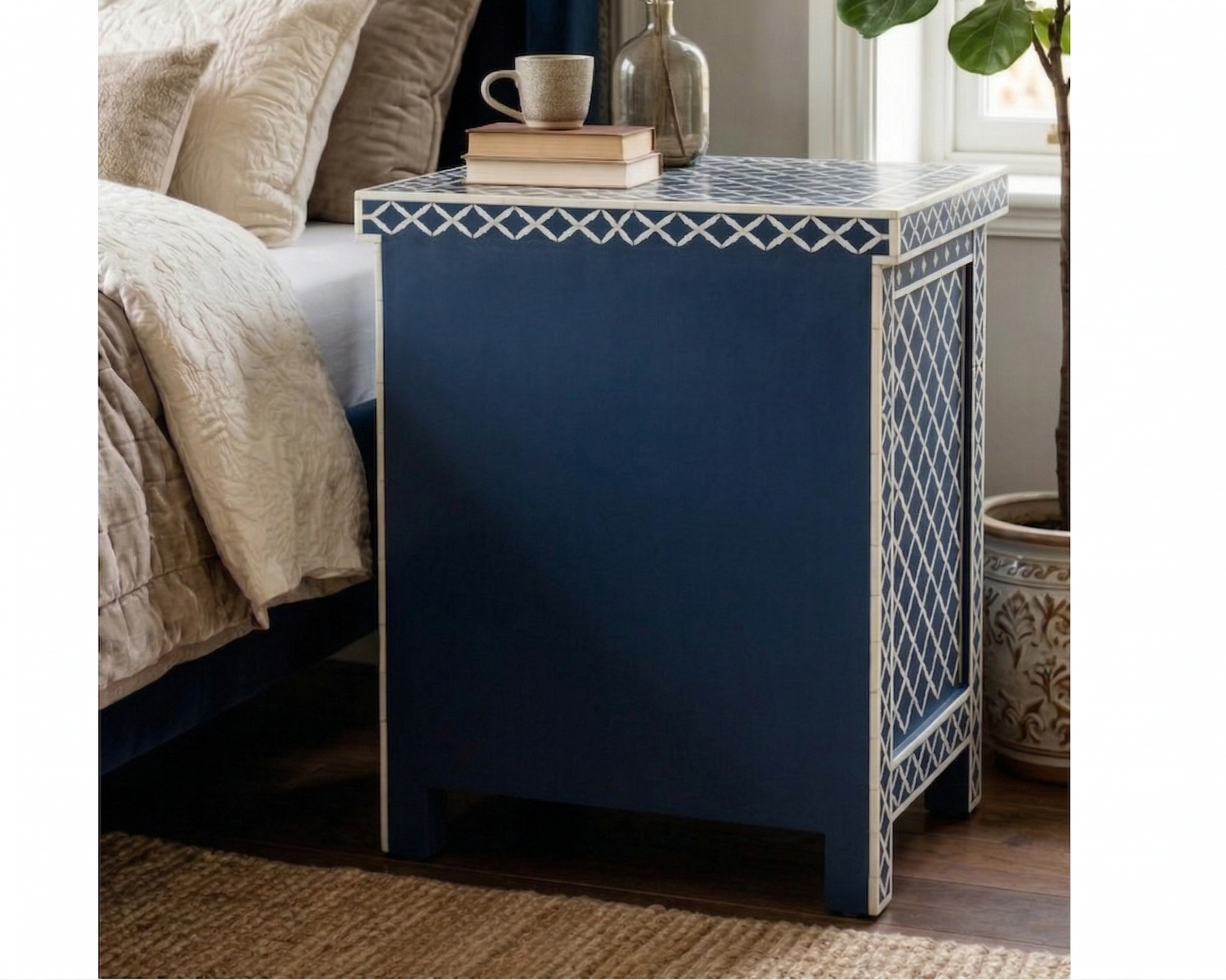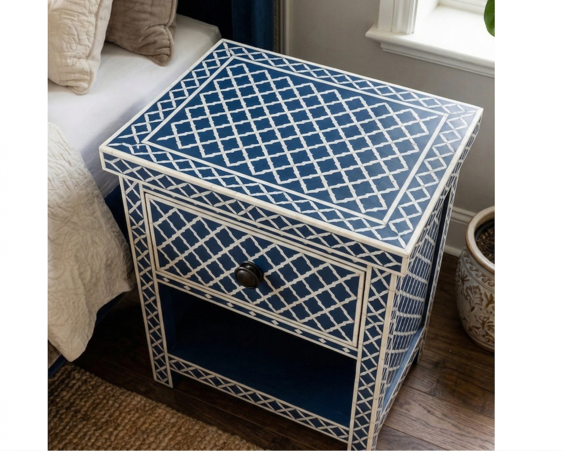 Add timeless elegance to your bedroom with this handcrafted Bone Inlay Bedside Table. Meticulously made by skilled artisans, each piece features intricate bone inlay patterns set into a sturdy wooden frame, creating a striking blend of traditional craftsmanship and contemporary design. The smooth tabletop offers ample space for lamps, books, or décor, while the drawer and shelf provide convenient storage for everyday essentials. Finished with fine detailing and a polished surface, this bedside table is both functional and a statement of luxury, making it a perfect addition to modern, classic, or eclectic interiors.