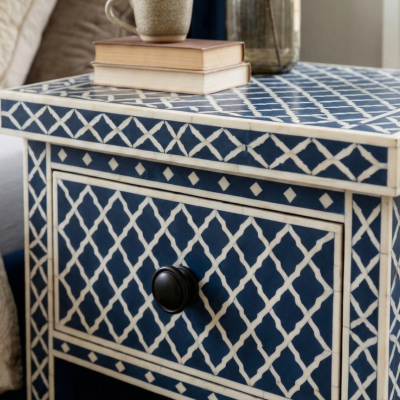 Bone inlay Navy Blue bedside table with 1 Drawer